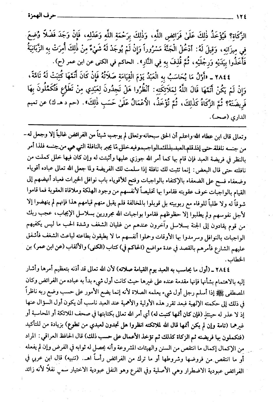 قال ابن عطاء الله : واعلم أن الحق سبحانه وتعالى لم يوجب شيئا من الفرائض غالبا إلا وجعل له من جنسه نافلة حتى إذا قام العبد بذلك الواجب وفيه خلل ما يجبر بالنافلة التي هي من جنسه فلذا أمر بالنظر في فريضة العبد فإن قام بها كما أمر الله جوزي عليها وأثبتت له وإن كان فيه خلل كملت من نافلته حتى قال البعض : إنما تثبت لك نافلة إذا سلمت لك الفريضة ولما جعل الله تعالى عباده أقوياء وضعفاء فسح على الصعفاء بالإكتفاء بالواجبات وفتح للأقوياء باب نوافل الخيرات فعباد أنهضهم إلى القيام بالواجبات خوف عقوبته فقاموا بها تخليصا لأنفسهم من وجود الهلكة وملافاة العقوبة فما قاموا شوقا له ولا طلبا للوفاء مع ربوبيته بل قوبلوا بالمخالفة فلم يقبل منهم قيامهم هذا فإنهم لم ينهضوا إلا لأجل نفوسهم ولم يطلبوا إلا حظوظهم فقاموا بواجبات الله مجرورين بسلاسل الإيجاب ، عجب ربك من قوم يقادون إلى الجنة بسلاسل وآخرون عندهم من غليان الشغف وشدة الحب ما ليس يكفيهم الواجبات بالنوافل وسرمدوا بها الأوقات وحملوا أنفسهم ما لا يطيقون بطاعته لباعث الشغف فأشفق عليهم الشارع فأمرهم بالقصد في عدة مواضع (الحاكم) في كتاب (الكنى) والألقاب (عن ابن عمر) بن الخطاب.