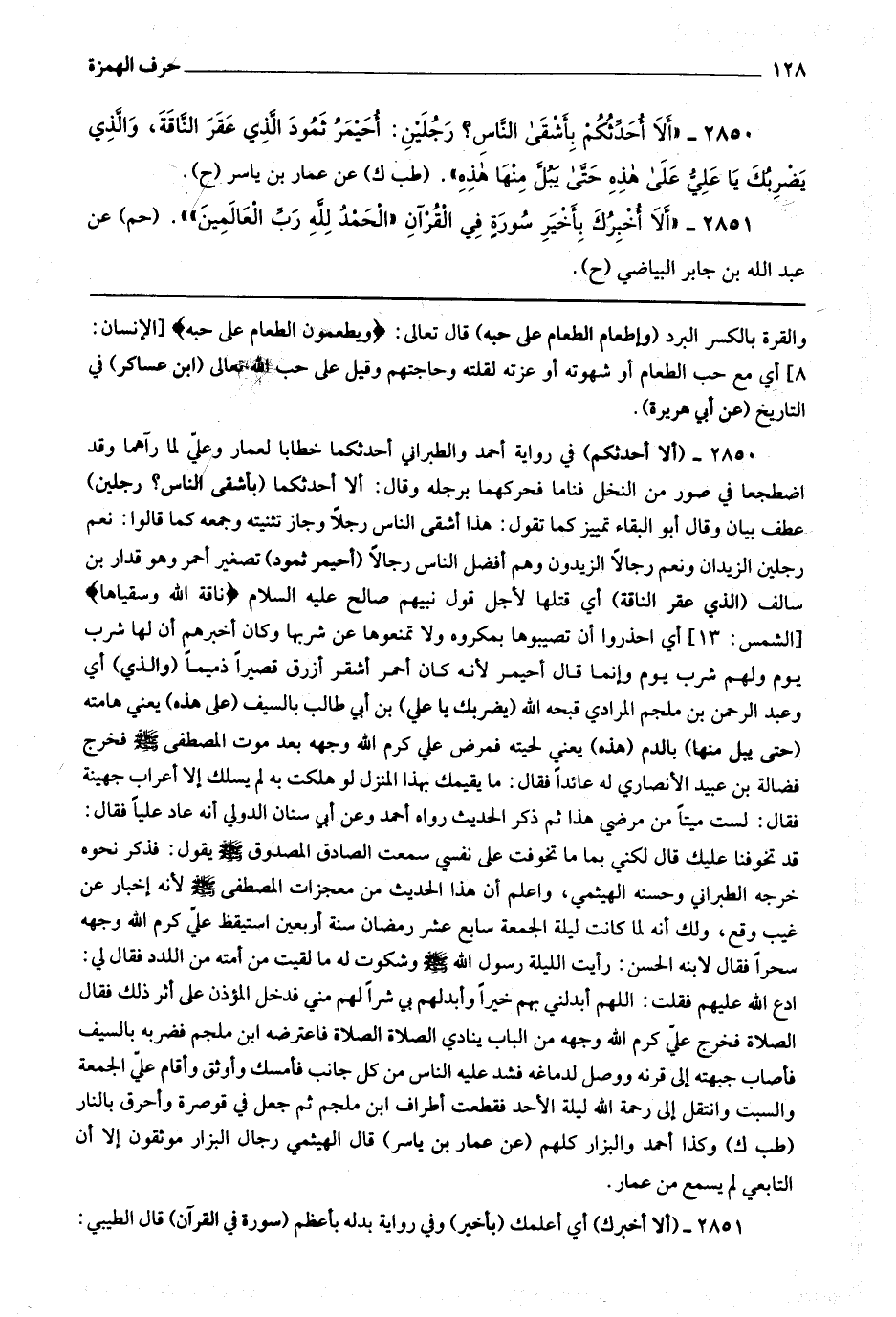2850 (ألا أحدثكم) في رواية أحمد والطبراني أحدثكما خطابا لعمار وعلي لما رآهما وقد اضطجعا في صور من النخل فناما فحركهما برجله وقال : ألا أحدثكما (بأشقى الناس ؟ رجلين) عطف بيان وقال أبو البقاء : تمييز كما تقول هذا أشقى الناس رجلا وجاز تثنيته وجمعه كما قالوا نعم الرجلين الزيدان ونعم رجالا الزيدون وهم أفضل الناس رجالا (أحيمر ثمود) تصغير أحمر وهو قدار بن سالف (الذي عقر الناقة) أي قتلها لأجل قول نبيهم صالح عليه السلام * (ناقة الله وسقياها) * أي احذروا أن تصيبوها بمكروه ولا تمنعوها عن شربها وكان أخبرهم أن لها شرب يوم ولهم شرب يوم وإنما قال أحيمر لأنه كان أحمر أشقر أزرق قصيرا ذميما (والذي) أي وعبد الرحمن بن ملجم المرادي قبحه الله (يضربك يا علي) بن أبي طالب بالسيف (على هذه) يعني هامته (حتى يبل منها) بالدم (هذه) يعني لحيته فمرض علي كرم الله وجهه بعد موت المصطفى صلى الله عليه وسلم فخرج فضالة بن عبيد الأنصاري له عائدا فقال : ما يقيمك بهذا المنزل لو هلكت به لم يسلك إلا أعراب جهينة فقال : لست ميتا من مرضي هذا ثم ذكر الحديث رواه أحمد وعن أبي سنان الدولي أنه عاد عليا فقال : قد تخوفنا عليك قال : لكني بما ما تخوفت على نفسي سمعت الصادق المصدوق صلى الله عليه وسلم يقول : فذكر نحوه خرجه الطبراني وحسنه الهيثمي ، واعلم أن هذا الحديث من معجزات المصطفى صلى الله عليه وسلم لأنه إخبار عن غيب وقع ، وذلك أنه لما كانت ليلة الجمعة سابع عشر رمضان سنة أربعين استيقظ علي كرم الله وجهه سحرا فقال لابنه الحسن : رأيت الليلة رسول الله صلى الله عليه وسلم وشكوت له ما لقيت من أمته من اللدد فقال لي : ادع الله عليهم فقلت : اللهم أبدلني بهم خيرا وأبدلهم بي شرا لهم مني فدخل المؤذن على أثر ذلك فقال : الصلاة فخرج علي كرم الله وجهه من الباب ينادي الصلاة الصلاة فاعترضه ابن ملجم فضربه بالسيف فأصاب جبهته إلى قرنه ووصل لدماغه فشد عليه الناس من كل جانب فأمسك وأوثق وأقام علي الجمعة