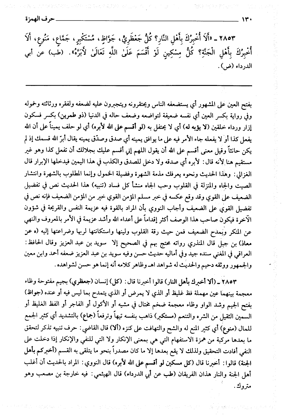 2853 (ألا أخبركم بأهل النار) قالوا : أخبرنا قال : (كل) إنسان (جعظري) بجيم مفتوحة وظاء معجمة بينهما عين مهملة فظ غليظ أو الذي لا يمرض أو الذي يتمدح بما ليس فيه أو عنده (جواظ) بفتح الجيم وشد الواو وظاء معجمة ضخم مختال في مشيه أو الأكول أو الفاجر أو الفظ الغليظ أو السمين الثقيل من الشره والتنعم (مستكبر) ذاهب بنفسه تيها وترفعا (جماع) بالتشديد أي كثير الجمع للمال (منوع) أي كثير المنع له والشح والتهافت على كنزه (ألا) قال القاضي : حرف تنبيه تذكر لتحقق ما بعدها مركبة من همزة الاستفهام التي هي بمعنى الإنكار ولا التي للنفي والإنكار إذا دخلت على النفي أفادت التحقيق ولذلك لا يقع بعدها إلا ما كان مصدرا بنحو ما يتلقى به القسم (أخبركم بأهل الجنة) قالوا : أخبرنا قال : (كل مسكين لو أقسم على الله لأبره) قال النووي : المراد بالحديث أن أغلب أهل الجنة والنار هذان الفريقان (طب عن أبي الدرداء) قال الهيثمي : فيه خارجة بن مصعب وهو متروك.