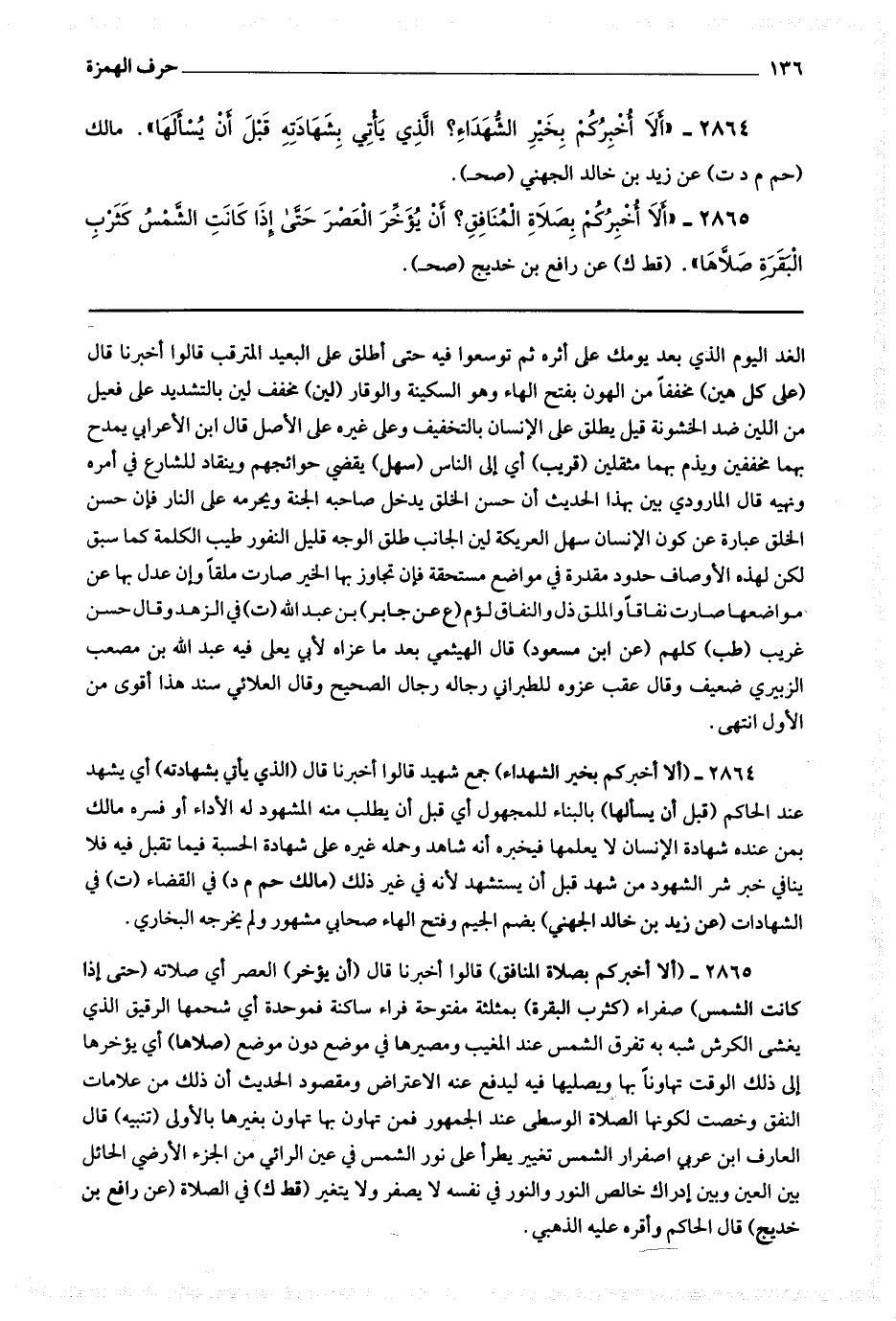 2864 (ألا أخبركم بخير الشهداء) جمع شهيد قالوا : أخبرنا قال : (الذي يأتي بشهادته) أي يشهد عند الحاكم (قبل أن يسألها) بالبناء للمجهول أي قبل أن يطلب منه المشهود له الأداء أو فسره مالك بمن عنده شهادة الإنسان لا يعلمها فيخبره أنه شاهد وحمله غيره على شهادة الحسبة فيما تقبل فيه فلا ينافي خبر شر الشهود من شهد قبل أن يستشهد لأنه في غير ذلك (مالك حم م د) في القضاء (ت) في الشهادات (عن زيد بن خالد الجهني) بضم الجيم وفتح الهاء صحابي مشهور ولم يخرجه البخاري.