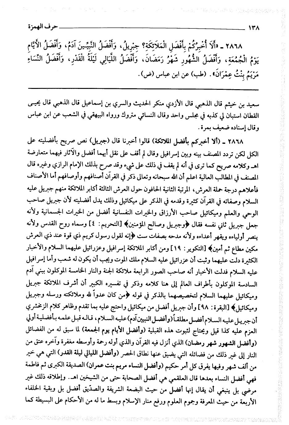 2868 (ألا أخبركم بأفضل الملائكة) قالوا : أخبرنا قال : (جبريل) نص صريح بأفضليته على الكل لكن تردد المصنف بينه وبين إسرافيل وقال : لم أقف على نقل أيهما أفضل والآثار فيهما متعارضة اه وكلامه صريح كما ترى في أنه لم يقف في ذلك على شئ وقد صرح بذلك الإمام الرازي وغيره قال المصنف في المطالب العالية : اعلم أن الله سبحانه وتعالى ذكر في القرآن أصنافهم وأوصافهم أما الأصناف فأعلاهم درجة حملة العرش ، المرتبة الثانية الحافون حول العرش ، الثالثة أكابر الملائكة منهم جبريل عليه السلام وصفاته في القرآن كثيرة وقدمه في الذكر على ميكائيل وذلك يدل أفضليته لأن جبريل صاحب الوحي والعلم وميكائيل صاحب الأرزاق والخيرات النفسانية أفضل من الخيرات الجسمانية ولأنه جعل جبريل ثاني نفسه فقال : * (وجبريل وصالح المؤمنين) * وسماه روح القدس ولأنه ينصر أولياءه ويقهر أعداءه ولأنه مدحه بصفات ست * (إنه لقول رسول كريم ذي قوة عند ذي العرش