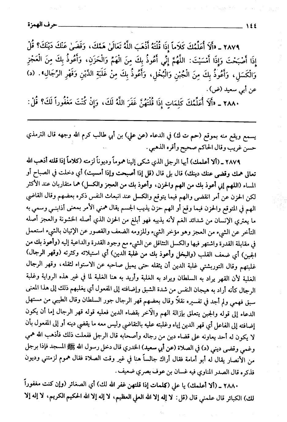 2880 (ألا أعلمك) يا علي (كلمات إذا قلتهن غفر الله لك) أي الصغائر (وإن كنت مغفورا لك) الكبائر قال : علمني.