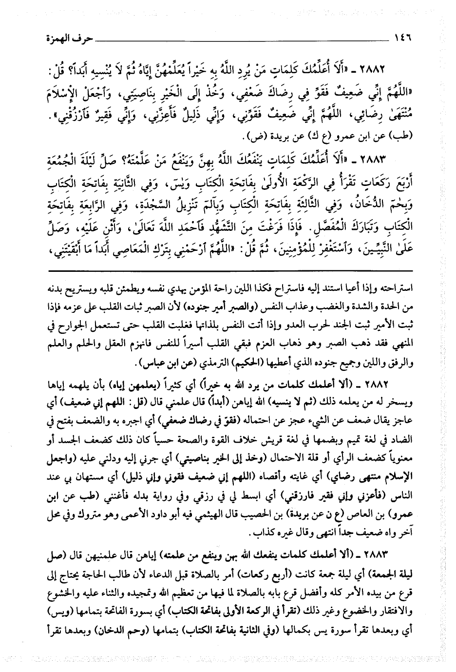 2883 (ألا أعلمك كلمات ينفعك الله بهن وتنفع من علمته) إياهن قال : علمنيهن قال : (صل ليلة الجمعة) أي ليلة جمعة كانت (أربع ركعات) أمر بالصلاة قبل الدعاء لأن طالب الحاجة يحتاج إلى قرع من بيده الأمر كله وأفضل قرع بابه بالصلاة لما فيها من تعظيم الله وتمجيده والثناء عليه والخشوع والافتقار والخضوع وغير ذلك (تقرأ في الركعة الأولى بفاتحة الكتاب) أي بسورة الفاتحة بتمامها (ويس) أي وبعدها تقرأ