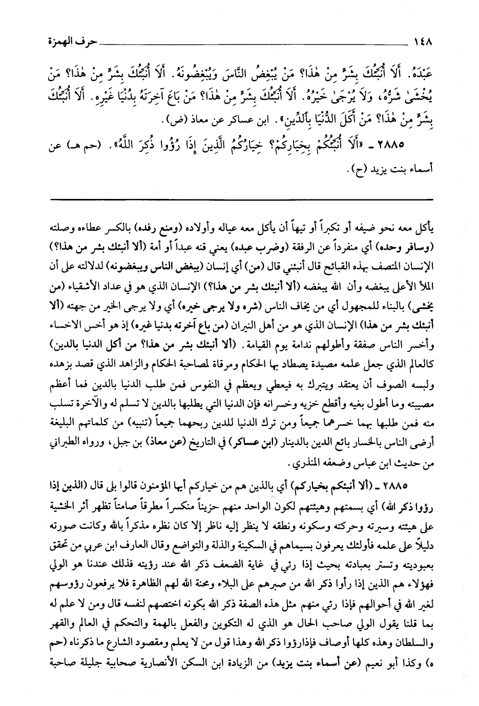 2885 (ألا أنبئكم بخياركم) أي بالذين هم من خياركم أيها المؤمنون قالوا : بلى قال : (الذين إذا رؤوا ذكر الله) أي بسمتهم وهيئتهم لكون الواحد منهم حزينا منكسرا مطرقا صامتا تظهر أثر الخشية على هيئته وسيرته وحركته وسكونه ونطقه لا ينظر إليه ناظر إلا كان نظره مذكرا بالله وكانت صورته دليلا على علمه فأولئك يعرفون بسيماهم في السكينة والذلة والتواضع وقال العارف ابن عربي : من تحقق بعبوديته وتستر بعبادته بحيث إذا رؤي في غاية الضعف ذكر الله عند رؤيته فذلك عندنا هو الولي فهؤلاء هم الذين إذا رؤوا ذكر الله من صبرهم على البلاء ومحنة الله لهم الظاهرة فلا يرفعون رؤوسهم لغير الله في أحوالهم فإذا رؤي منهم مثل هذه الصفة ذكر الله بكونه اختصهم لنفسه قال : ومن لا علم له بما قلنا يقول الولي صاحب الحال هو الذي له التكوين والفعل بالهمة والتحكم في العالم والقهر والسلطان وهذه كلها أوصاف فإذا رؤوا ذكر الله وهذا قول من لا يعلم ومقصود الشارع ما ذكرناه (حم ه) وكذا أبو نعيم (عن أسماء بنت يزيد) من الزيادة ابن السكن الأنصارية صحابية جليلة صاحبة