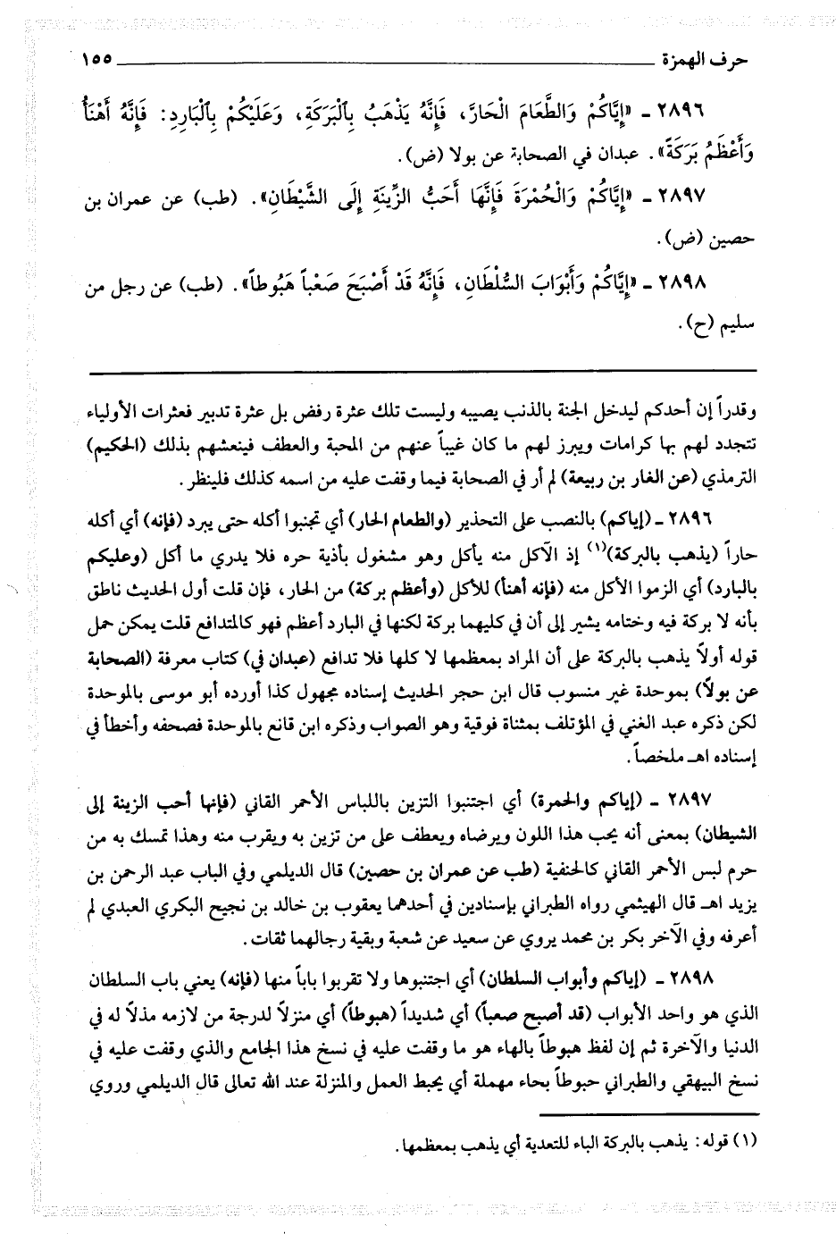 2896 (إياكم) بالنصب على التحذير (والطعام الحار) أي تجنبوا أكله حتى يبرد (فإنه) أي أكله حارا (يذهب بالبركة (1) إذ الآكل منه يأكل وهو مشغول بأذية حره فلا يدري ما أكل (وعليكم بالبارد) أي الزموا الأكل منه (فإنه أهنأ) للأكل (وأعظم بركة) من الحار ، فإن قلت : أول الحديث ناطق بأنه لا بركة فيه وختامه يشير إلى أن في كليهما بركة لكنها في البارد أعظم فهو كالمتدافع قلت : يمكن حمل قوله أولا يذهب بالبركة على أن المراد بمعظمها لا كلها فلا تدافع (عبدان في) كتاب معرفة (الصحابة