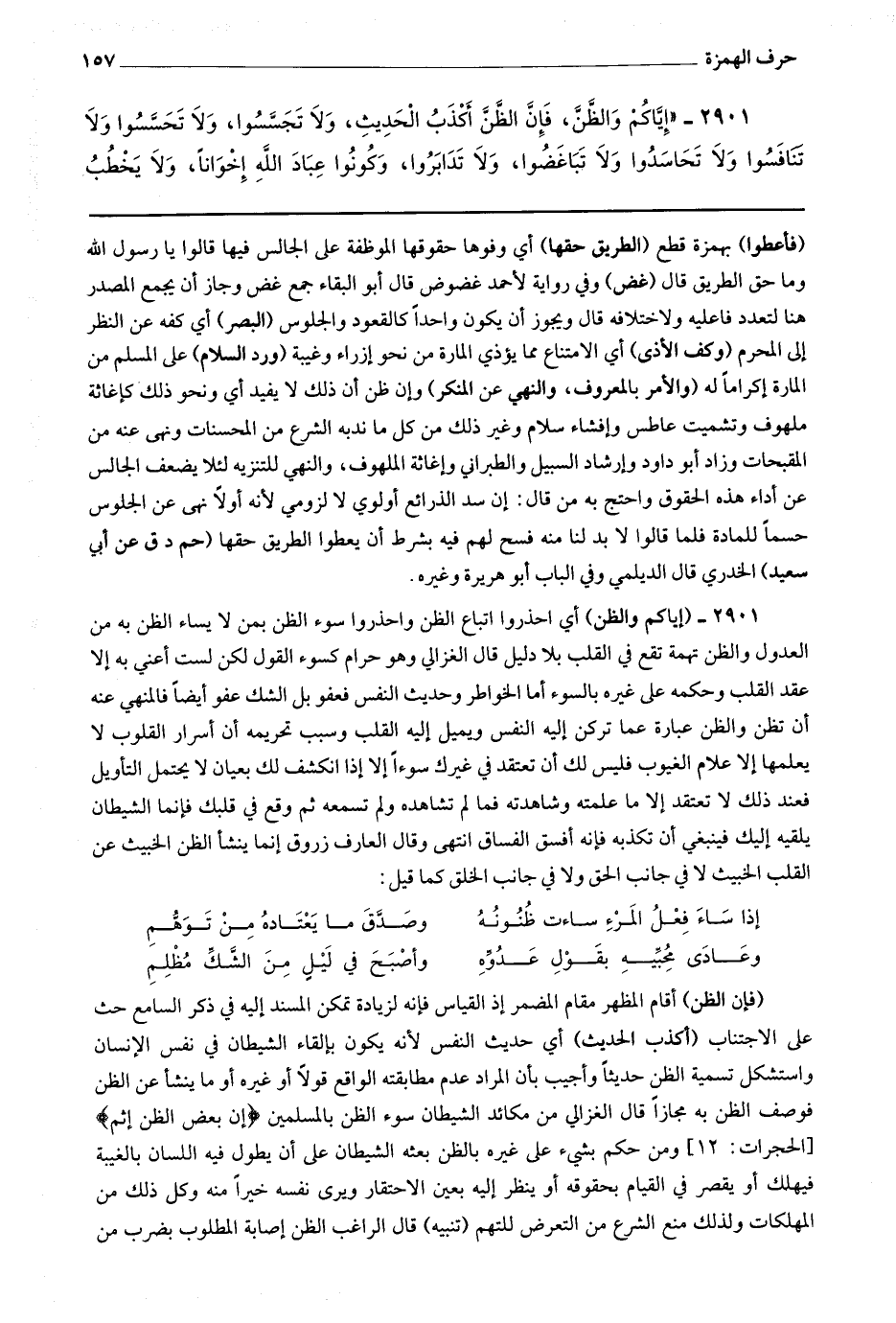 2901 (إياكم والظن) أي احذروا اتباع الظن واحذروا سوء الظن بمن لا يساء الظن به من العدول والظن تهمة تقع في القلب بلا دليل قال الغزالي : وهو حرام كسوء القول لكن لست أعني به إلا عقد القلب وحكمه على غيره بالسوء أما الخواطر وحديث النفس فعفو بل الشك عفو أيضا فالمنهي عنه أن تظن والظن عبارة عما تركن إليه النفس ويميل إليه القلب وسبب تحريمه أن أسرار القلوب لا يعلمها إلا علام الغيوب فليس لك أن تعتقد في غيرك سوءا إلا إذا انكشف لك بعيان لا يحتمل التأويل فعند ذلك لا تعتقد إلا ما علمته وشاهدته فملم تشاهده ولم تسمعه ثم وقع في قلبك فإنما الشيطان يلقيه إليك فينبغي أن تكذب فإنه أفسق الفساق انتهى وقال العارف زروق : إنما ينشأ الظن الخبيث عن القلب الخبيث لا في جانب الحق ولا في جانب الخلق كما قيل : إذا ساء فعل المرء ساءت ظنونه * وصدق ما يعتاده من توهم وعادى محبيه بقول عدوه * وأصبح في ليل من الشك مظلم (فإن الظن) أقام المظهر مقام المضمر إذ القياس فإنه لزيادة تمكن المسند إليه في ذكر السامع حث على الاجتناب (أكذب الحديث) أي حديث النفس لأنه يكون بإلقاء الشيطان في نفس الإنسان واستشكل تسمية الظن حديثا وأجيب بأن المراد عدم مطابقته الواقع قولا أو غيره أو ما ينشأ عن الظن فوصف الظن به مجازا.