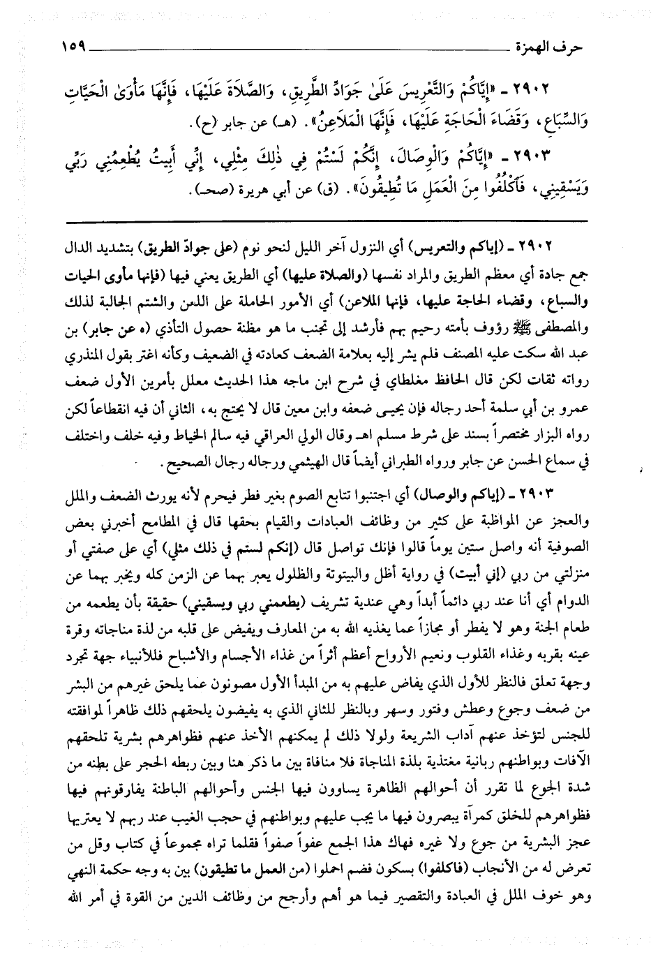 2903 (إياكم والوصال) أي اجتنبوا تتابع الصوم بغير فطر فيحرم لأنه يورث الضعف والملل والعجز عن المواظبة على كثير من وظائف العبادات والقيام بحقها.