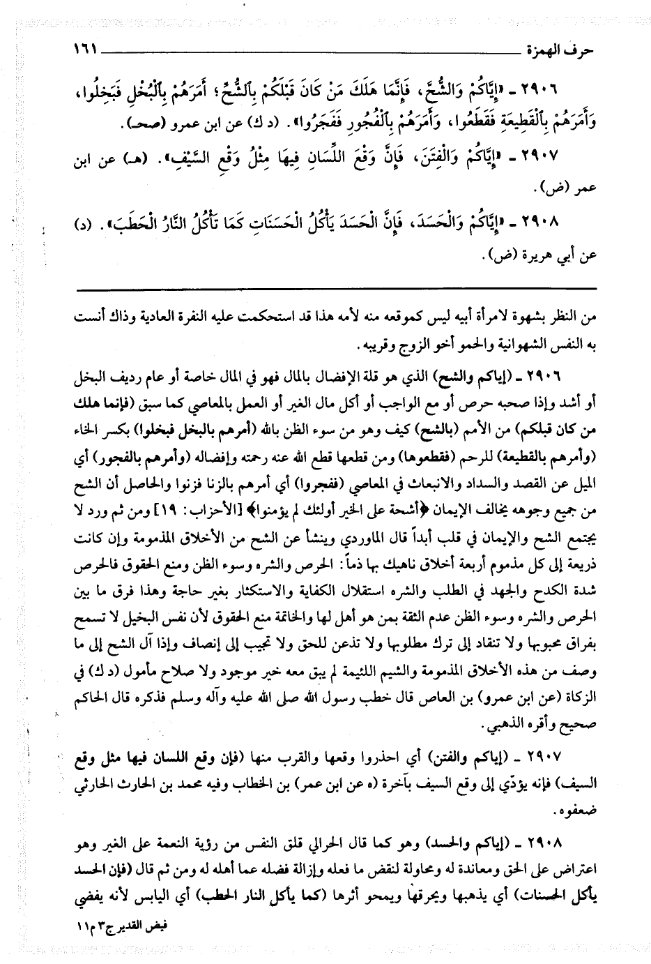 2906 (إياكم والشح) الذي هو قلة الإفضال بالمال فهو في المال خاصة أو عام رديف البخل أو أشد وإذا صحبه حرص أو مع الواجب أو أكل مال الغير أو العمل بالمعاصي كما سبق (فإنما هلك