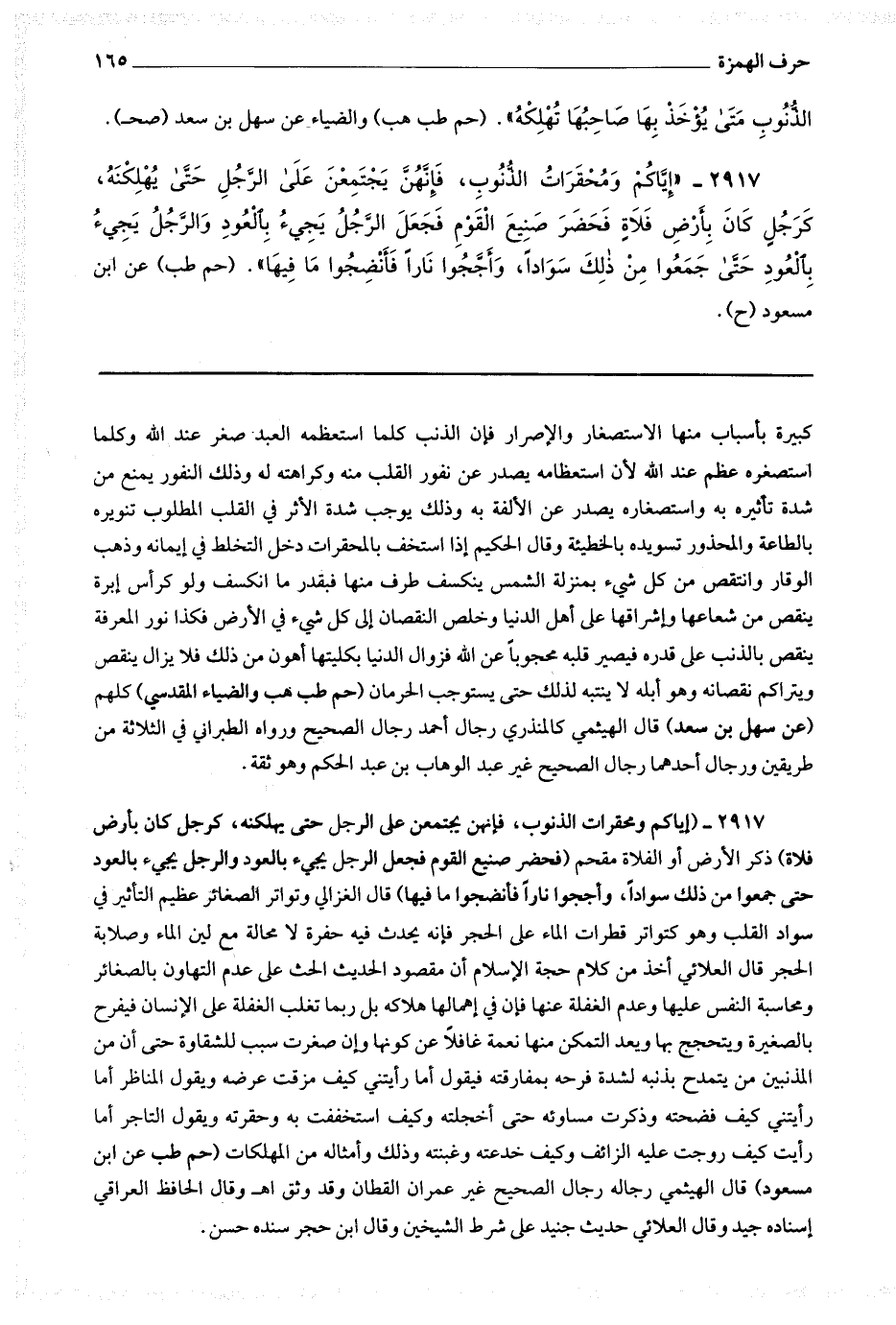 2917 (إياكم ومحقرات الذنوب فإنهن يجتمعن على الرجل حتى يهلكنه كرجل كان بأرض فلاة) ذكر الأرض أو الفلاة مقحم (فحضر صنيع القوم فجعل الرجل يجئ بالعود والرجل يجئ بالعود حتى جمعوا من ذلك سوادا وأججوا نارا فأنضجوا ما فيها) قال الغزالي : وتواتر الصغائر عظيم التأثير في سواد القلب وهو كتواتر قطرات الماء على الحجر فإنه يحدث فيه حفرة لا محالة مع لين الماء وصلابة الحجر قال العلائي : أخذ من كلام حجة الإسلام أن مقصود الحديث الحث على عدم التهاون بالصغائر