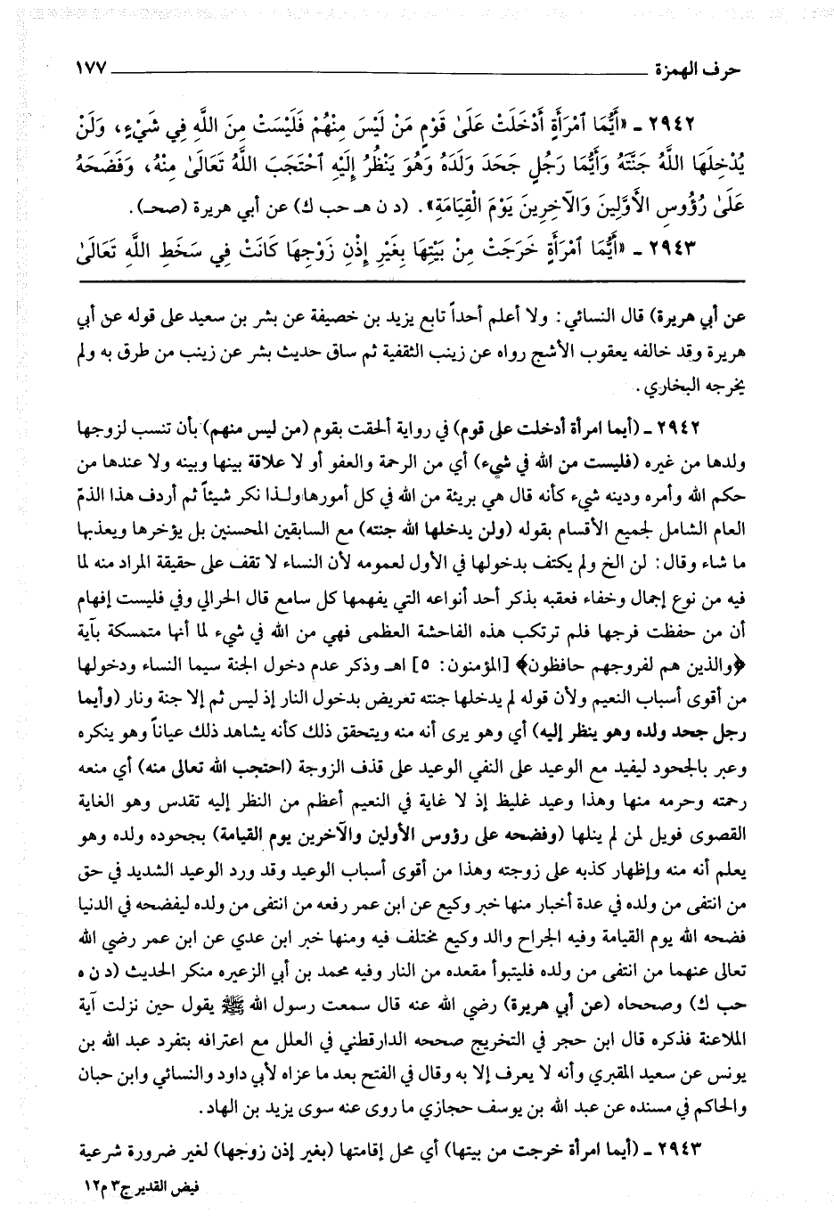 2942 (أيما امرأة أدخلت على قوم) في رواية ألحقت بقوم (من ليس منهم) بأن تنسب لزوجها ولدها من غيره (فليست من الله في شئ) أي من الرحمة والعفو أو لا علاقة بينها وبينه ولا عندها من حكم الله وأمره ودينه شئ كأنه قال : هي بريئة من الله في كل أمورها ولذا أنكر شيئا ثم أردف هذا الذم العام الشامل لجميع الأقسام بقوله (ولن يدخلها الله جنته) مع السابقين المحسنين بل يؤخرها ويعذبها ما شاء وقال لن إلخ ولم يكتف بدخولها في الأول لعمومه لأن النساء لا تقف على حقيقة المراد منه لما فيه من نوع إجمال وخفاء فعقبه بذكر أحد أنواعه التي يفهمها كل سامع قال الحرالي : وفي فليست إفهام أن من حفظت فرجها فلم ترتكب هذه الفاحشة العظمى فهي من الله في شئ لما أنها متمسكة بآية * (والذين هم لفروجهم حافظون) * اه وذكر عدم دخول الجنة سيما النساء ودخولها من أقوى أسباب النعيم ولأن قوله لم يدخلها جنته تعريض بدخول النار إذ ليس ثم إلا جنة ونار (وأيما رجل جحد ولده وهو ينظر إليه) أي وهو يرى أنه منه ويتحقق ذلك كأنه يشاهد ذلك عيانا وهو ينكره وعبر بالجحود ليفيد مع الوعيد على النفي الوعيد على قذف الزوجة (احتجب الله تعالى منه) أي منعه رحمته وحرمه منها وهذا وعيد غليظ إذ لا غاية في النعيم أعظم من النظر إليه تقدس وهو الغاية القصوى فويل لمن لم ينلها (وفضحه على رؤوس الأولين والآخرين يوم القيامة) بجحوده ولده وهو يعلم أنه منه وإظهار كذبه على زوجته وهذا من أقوى أسباب الوعيد وقد ورد الوعيد الشديد في حق من انتفى من ولده في عدة أخبار منها خبر وكيع عن ابن عمر رفعه من انتفى من ولده ليفضحه في الدنيا فضحه الله يوم القيامة وفيه الجراح والد وكيع مختلف فيه ومنها خبر ابن عدي عن ابن عمر رضي الله تعالى عنهما من انتفى من ولده فليتبوأ مقعده من النار وفيه محمد بن أبي الزعيرة منكر الحديث (د ن ه حب ك) وصححاه (عن أبي هريرة) رضي الله عنه قال : سمعت رسول الله صلى الله عليه وسلم يقول حين نزلت آية