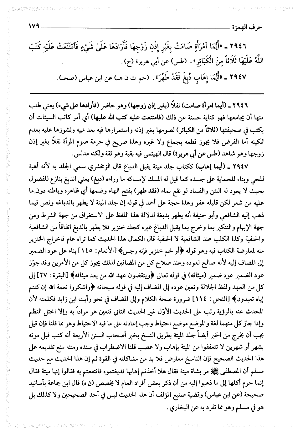 كل من العهد ولفظ الجلالة وتعين عوده إلى المضا ف إليه في قوله سبحانه * (واشكروا نعمة الله إن كنتم إياه تعبدون) * ضرورة صحة الكلام وإلى المضاف في نحو رأيت ابن زايد فكلمته لأن المحدث عنه بالرؤية رتب على الحديث الأول غير الحديث الثاني فتعين هو مرادا به وإلا اختل النظم وإذا جاز كل منهما لغة والموضع موضع احتياط وجب إعادته على ما فيه الاحتياط وهو ممقلنا فإن قيل يجب أن يخرج من الخبر أيضا جلد الميتة بطريق النسخ بخبر أصحاب السنن الأربعة أنه كتب قبل موته بشهر أو شهرين لا تتعففوا من الميتة بإهاب ولاعصب قلنا الاضطراب في سنده ومتنه منع تقديمه على هذا الحديث الصحيح فإن الناس معارض فلا بد من مشاكلته في القوة ثم إن هذا الحديث مع حديث مسلم أن المصطفى صلى الله عليه وسلم مر بشاة ميتة فقال : هلا أخذتم إهابها فدبغتموه فانتفعتم به فقالوا : إنها ميتة فقال : إنما حرم أكلها إلى ما ذهبوا إليه من أن ذكر بعض أفراد العام لا يخصص (ن ه) قال ابن جماعة بأسانيد صحيحة (عن ابن عباس) وقضية صنيع المؤلف أن هذا الحديث ليس في أحد الصحيحين ولا كذلك بل هو في مسلم وهو مما تفرد به عن البخاري.