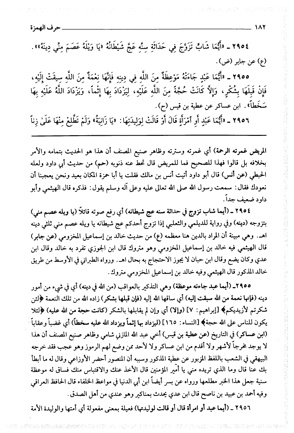 2955 (أيما عبد جاءته موعظة) وهي التذكير بالعواقب (من الله في دينه) أي في شئ من أمور دينه (فإنها نعمة من الله سبقت إليه) أي ساقها الله إليه (فإن قبلها بشكر) زاده الله من تلك النعمة * (لئن شكرتم لأزيدنكم) * (وإلا) أي وإن لم يقابلها بالشكر (كانت حجة من الله عليه) * (لئلا يكون للناس على الله حجة) * (ليزداد بها إثما ويزداد الله عليه بها سخطا) أي غضبا وعقابا (ابن عساكر) في التاريخ (عن عطية بن قيس) أخي عبد الله المازني شامي وظاهر صنيع المصنف أن هذا لا يوجد مخرجا لأشهر ولا أقدم من ابن عساكر ولا لأحد ممن وضع لهم الرموز وهو عجب فقد خرجه البيهقي في الشعب باللفظ المزبور عن عطية المذكور وسببه أن المنصور أحضر الأوزاعي وقال له : ما أبطأ بك عنا قال : وما الذي تريده مني يا أمير المؤمنين قال : الأخذ عنك والاقتباس منك فساق له موعظة سنية جعل هذا الخبر مطلعها ورواه عن بسر أيضا ابن أبي الدنيا في مواعظ الخلفاء قال الحافظ العراقي وفيه أحمد بن عبيد بن ناصح قال ابن عدي : يحدث بمناكير وهو عندي من أهل الصدق.