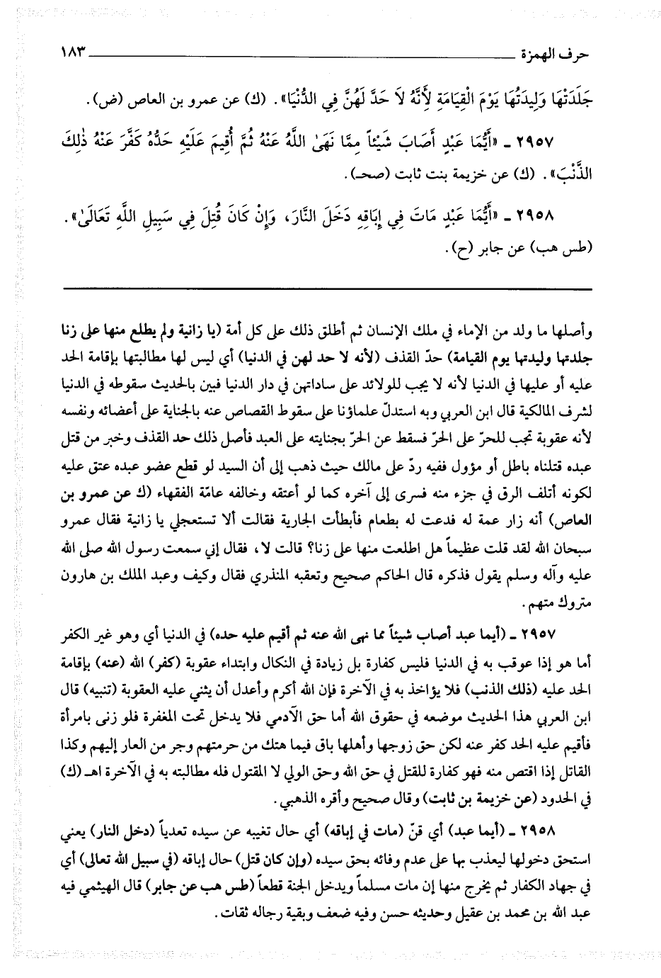 2957 (أيما عبد أصاب شيئا مما نهى الله عنه ثم أقيم عليه حده) في الدنيا أي وهو غير الكفر أما هو إذا عوقب به في الدنيا فليس كفارة بل زيادة في النكال وابتداء عقوبة (كفر) الله (عنه) بإقامة الحد عليه (ذلك الذنب) فلا يؤاخذ به في الآخرة فإن الله أكرم وأعدل أن يثني عليه العقوبة (تنبيه) قال ابن العربي : هذا الحديث موضعه في حقوق الله أما حق الآدمي فلا يدخل تحت المغفرة فلو زنى بامرأة فأقيم عليه الحد كفر عنه لكن حق زوجها وأهلها باق فيما هتك من حرمتهم وجر من العار إليهم وكذا القاتل إذ اقتص منه فهو كفارة للقتل في حق الله وحق الولي لا المقتول فله مطالبته به في الآخرة اه (ك) في الحدود (عن خزيمة بن ثابت) وقال : صحيح وأقره الذهبي.