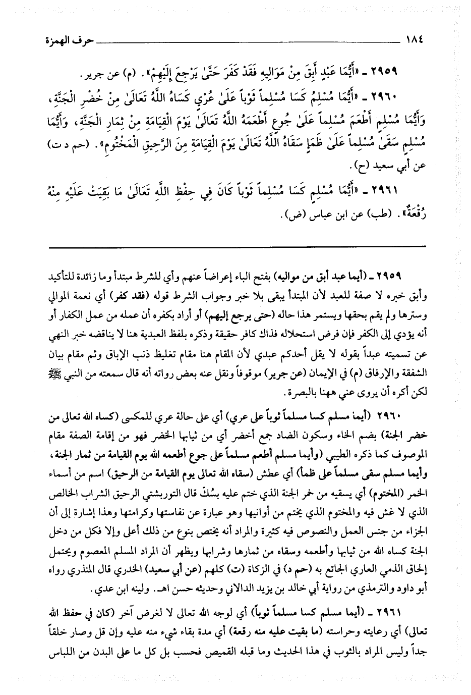2960 (أيما مسلم كسامسلما ثوبا على عري) أي على حالة عري للمكسي (كساه الله تعالى من خضر الجنة بضم الخاء وسكون الضاد جمع أخضر أي من ثيابها الخضر فهو من إقامة الصفة مقام الموصوف كما ذكره الطيبي (وأيما مسلم أطعم مسلما على جوع أطعمه الله يوم القيامة من ثمار الجنة وأيما مسلم سقى مسلما على ظمأ) أي عطش (سقاه الله تعالى يوم القيامة من الرحيق) اسم من أسماء الخمر (المختوم) أي يسقيه من خمر الجنة الذي ختم عليه بمسك قال النوربشتي : الرحيق الشراب الخالص الذي لا غش فيه والمختوم الذي يختم من أوانيها وهو عبارة عن نفاستها وكرامتها وهذا إشارة إلى أن الجزاء من جنس العمل والنصوص فيه كثيرة والمراد أنه يختص بنوع من ذلك أعلى وإلا فكل من دخل الجنة كساه الله من ثيابها وأطعمه وسقاه من ثمارها وشرابها ويظهر أن المراد المسلم المعصوم ويحتمل إلحاق الذمي العاري الجائع به (حم د) في الزكاة (ت) كلهم (عن أبي سعيد) الخدري قال المنذري : رواه أبو داود والترمذي من رواية أبي خالد بن يزيد الدالاني وحديثه حسن اه.