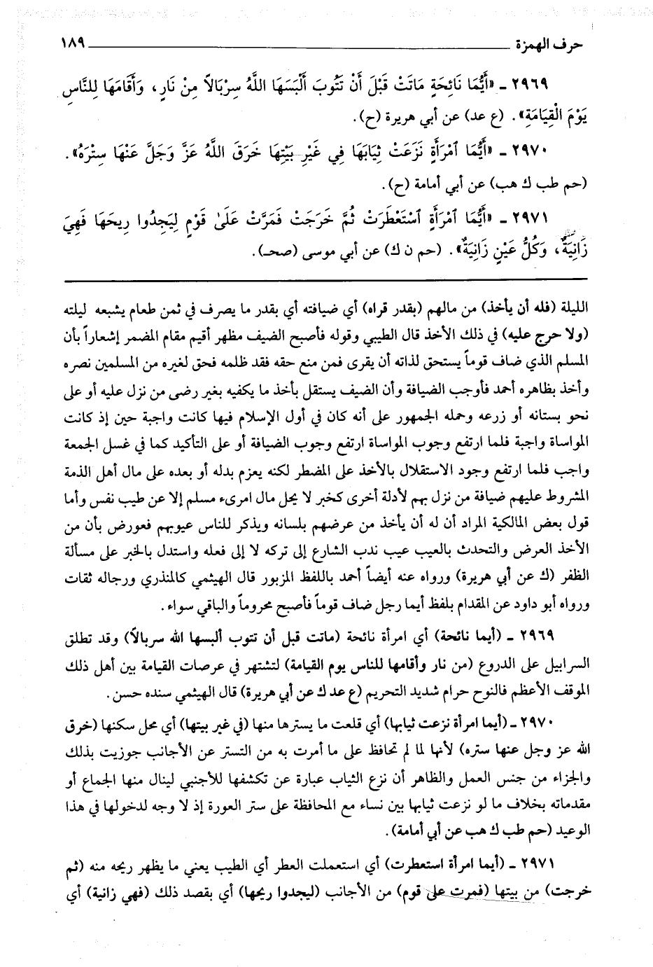 2971 (أيما امرأة استعطرت) أي استعملت العطر أي الطيب يعني ما يظهر ريحه منه (ثم خرجت) من بيتها (فمرت على قوم) من الأجانب (ليجدوا ريحها) أي بقصد ذلك (فهي زانية) أي