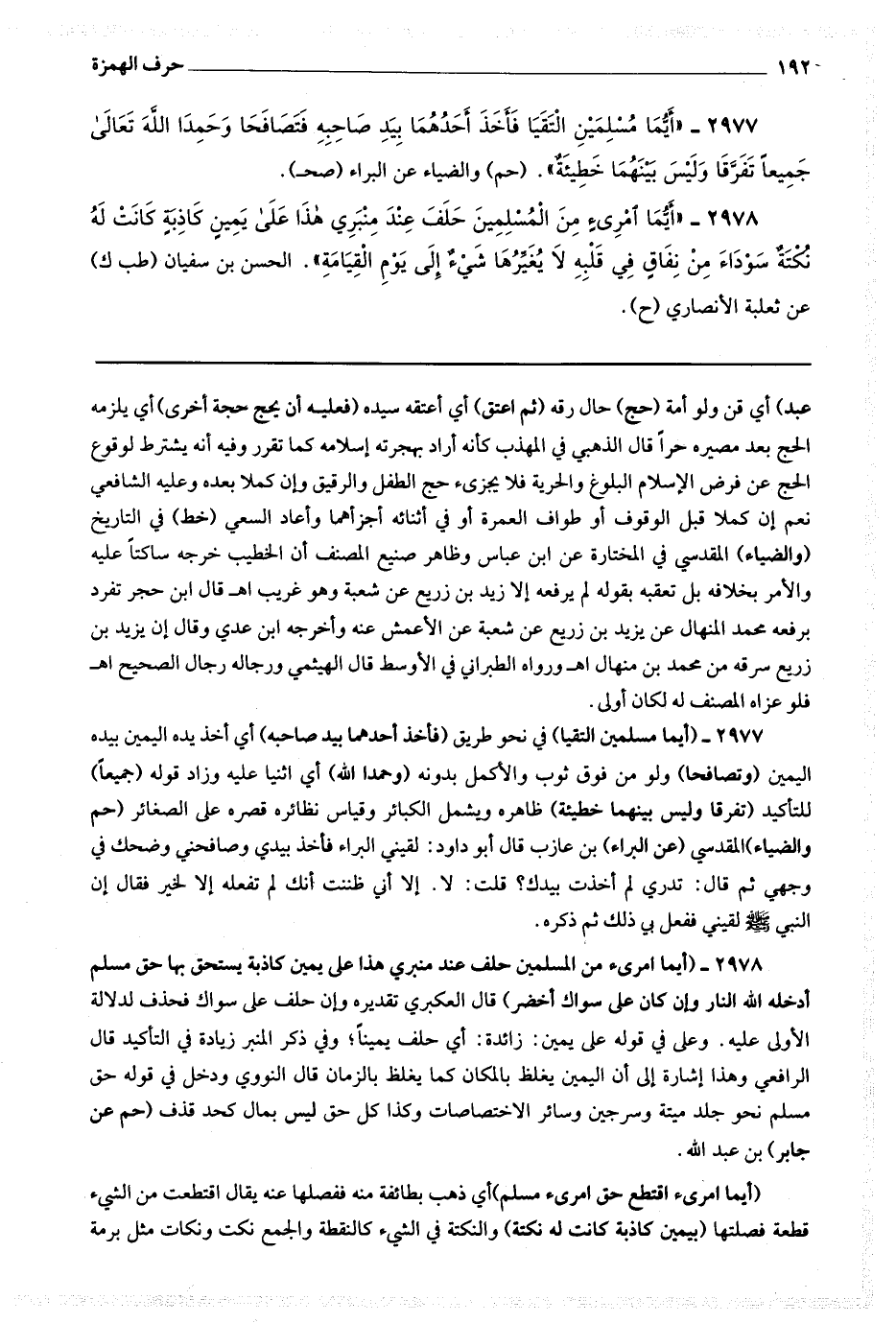 2978 (أيما امرئ من المسلمين حلف عند منبري هذا على يمين كاذبة يستحق بها حق مسلم أدخله الله النار وإن كان على سواك أخضر) قال العكبري : تقديره وإن حلف على سواك فحذف لدلالة الأولى عليه وعلى في قوله على يمين زائدة أي حلف يمينا ، وفي ذكر المنبر زيادة في التأكيد قال الرافعي : وهذا إشارة إلى أن اليمين يغلظ بالمكان كما يغلظ بالزمان قال النووي : ودخل في قوله حق مسلم نحو جلد ميتة وسرجين وسائر الاختصاصات وكذا كل حق ليس بمال كحد قذف (حم عن جابر) بن عبد الله.