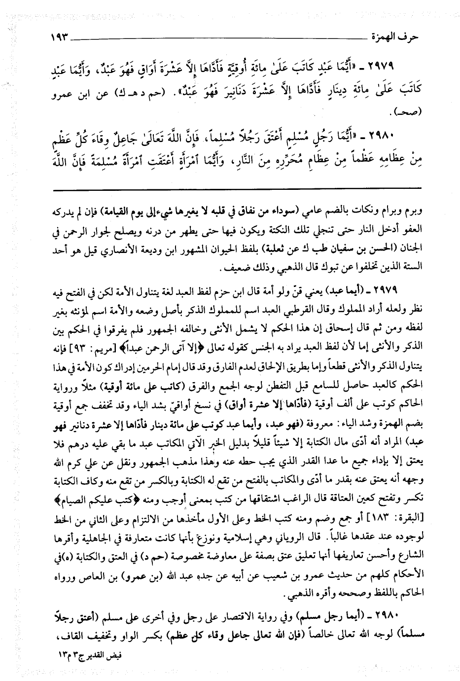 2979 (أيما عبد) يعني قن ولو أمة قال ابن حزم : لفظ العبد لغة يتناول الأمة لكن في الفتح فيه نظر ولعله أراد المملوك وقال القرطبي : العبد اسم للملوك الذكر بأصل وضعه والأمة اسم لمؤنثه بغير لفظه ومن ثم قال إسحاق : إن هذا الحكم لا يشمل الأنثى وخالفه الجمهور فلم يفرقوا في الحكم بين الذكر والأنثى إما لأن لفظ العبد يراد به الجنس كقوله تعالى * (إلا آتي الرحمن عبدا) * فإنه يتناول الذكر والأنثى قطعا وإما بطريق الإلحاق لعدم الفارق وقد قال إمام الحرمين : إدراك كون الأمة في هذا الحكم كالعبد حاصل للسامع قبل التفطن لوجه الجمع والفرق (كوتب على مائة اوقية) مثلا ورواية الحاكم كوتب على ألف أوقية (فأداها إلا عشرة أواق) في نسخ أواقي بشد الياء وقد تخفف جمع أوقية