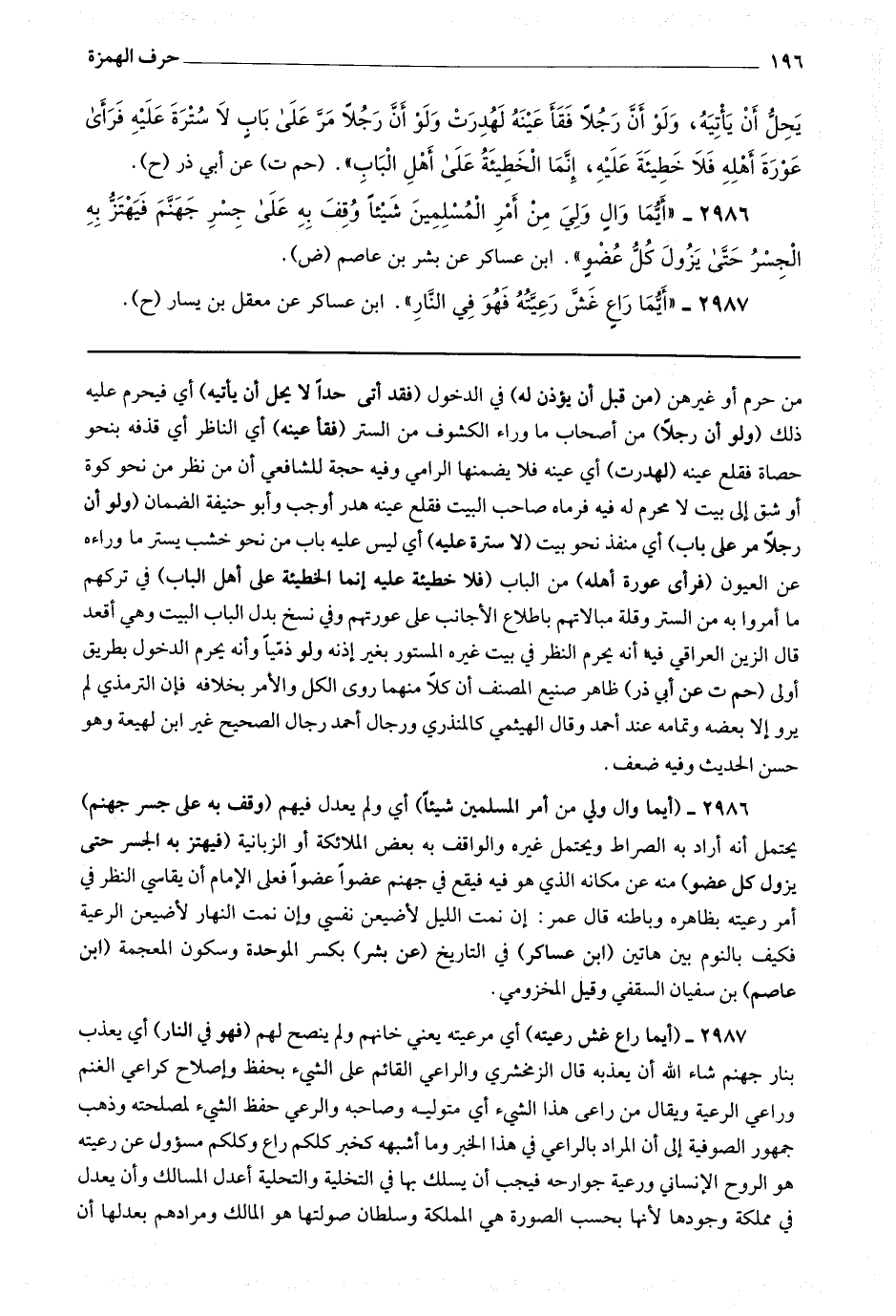 2986 (أيما وال ولي من أمر المسلمين شيئا) أي ولم يعدل فيهم (وقف به على جسر جهنم) يحتمل أنه أراد به الصراط ويحتمل غيره والواقف به بعض الملائكة أو الزبانية (فيهتز به الجسر حتى يزول كل عضو) من عن مكانه الذي هو فيه فيقع في جهنم عضوا عضوا فعلى الإمام أن يقاسي النظر في أمرعيته بظاهره وباطنه قال عمر : إن نمت الليل لأضيعن نفسي وإن نمت النهار لأضيعن الرعية فكيف بالنوم بين هاتين (ابن عساكر) في التاريخ (عن بشر) بكسر الموحدة وسكون المعجمة (ابن عاصم) بن سفيان السقفي وقيل المخزومي.