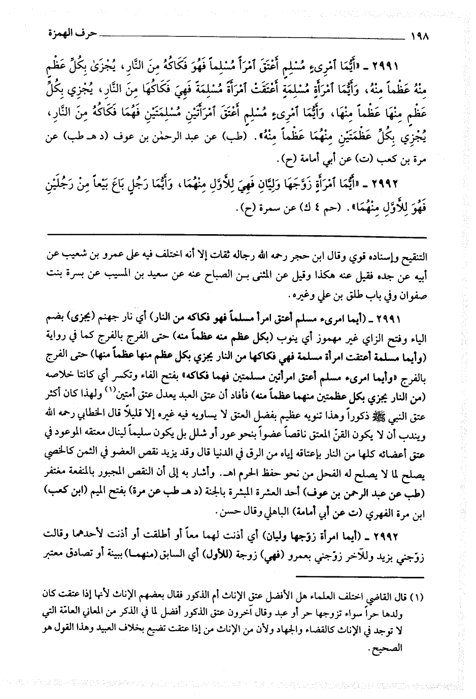 2991 (أيما امرئ مسلم أعتق امرأ مسلما فهو فكاكه من النار) أي نار جهنم (يجزى) بضم الياء وفتح الزاي غير مهموز أي ينوب (بكل عظم منه عظمامنه) حتى الفرج بالفرج كما في رواية (وأيما امرأة مسلمة أعتقت امرأة مسلمة فهي فكاكها من النار تجزى بكل عظم منها عظما منها) حتى الفرج بالفرج وأيما امرئ مسلم أعتق امرأتين مسلمتين فهما فكاكه) بفتح الفاء وتكسر أي كانتا خلاصه (من النار يجزى بكل عظمتين منهما عظما منه) فأفاد أن عتق العبد يعدل عتق أمتين (1) ولهذا كان أكثر عتق النبي صلى الله عليه وسلم ذكورا وهذا تنويه عظيم بفضل العتق لا يساويه فيه غيره إلا قليلا.