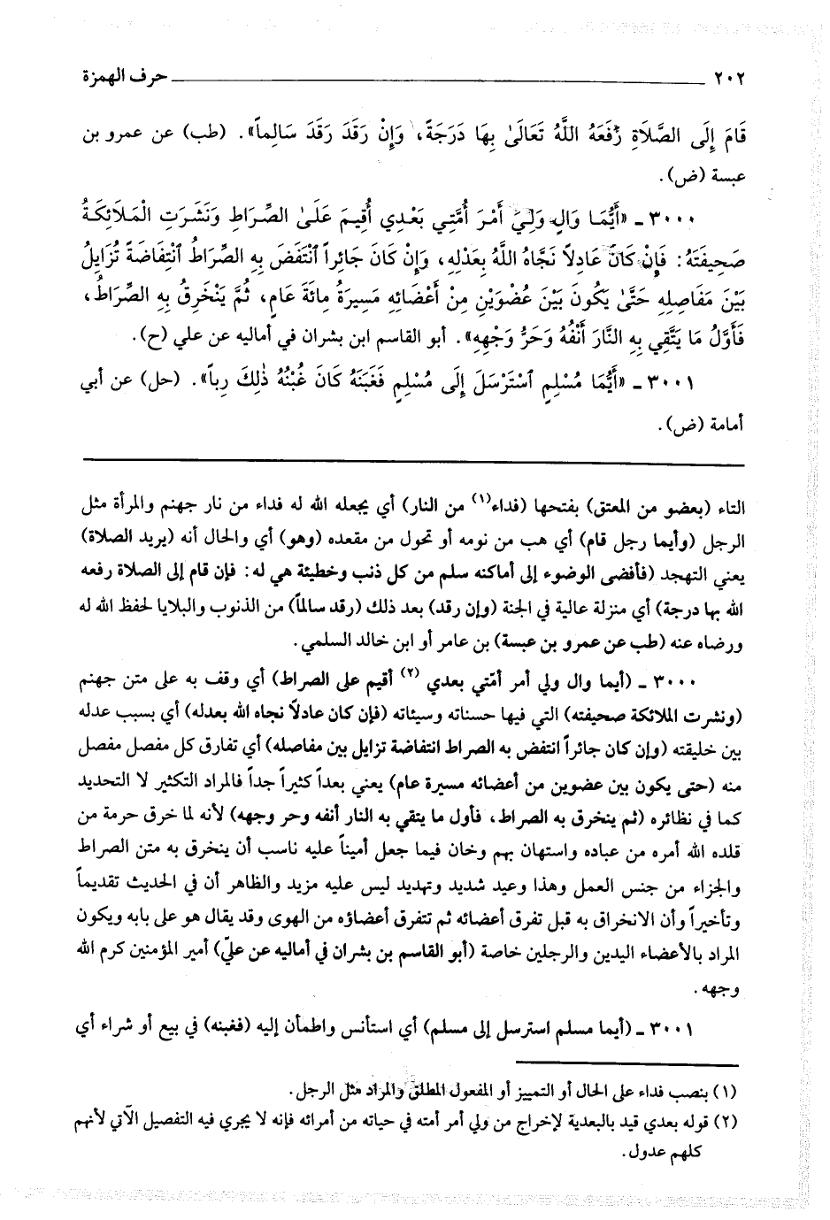 3000 (أيما وال ولي أمر أمتي بعدي (1) أقيم على الصراط) أي وقف به على متن جهنم (ونشرت الملائكة صحيفته) التي فيها حسناته وسيئاته (فإن كان عادلا نجاه الله بعدله) أي بسبب عدله بين خليقته (وإن كان جائرا انتفض به الصراط انتفاضة تزايل بين مفاصله) أي تفارق كل مفصل مفصل منه (حتى يكون بين عضوين من أعضائه مسيرة عام) يعني بعدا كثيرا جدا فالمراد التكثير لا التحديد كما في نظائره (ثم ينخرق به الصراط فأول ما يتقي به النار أنفه وحر وجهه) لأنه لما خرق حرمة من قلده الله أمره من عباده واستهان بهم وخان فيما جعل أمينا عليه ناسب أن ينخرق به متن الصراط والجزاء من جنس العمل وهذا وعيد شديد وتهديد ليس عليه مزيد والظاهر أن في الحديث تقديما وتأخيرا وأن الانخراق به قبل تفرق أعضائه ثم تتفرق أعضاؤه من الهوى وقد يقال هو على بابه ويكون المراد بالأعضاء اليدين والرجلين خاصة (أبو القاسم بن بشران في أماليه عن علي) أمير المؤمنين كرم الله وجهه.