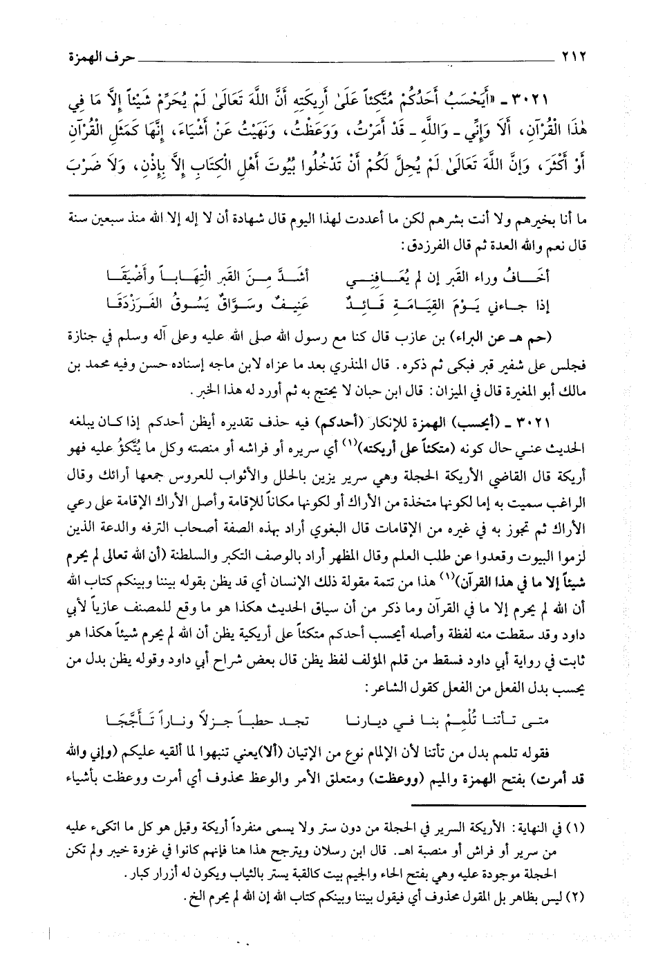 3021 (أيحسب) الهمزة للإنكار (أحدكم) فيه حذف تقديره أيظن أحدكم (إذا كان يبلغه الحديث عني) حال كونه (متكئا على أريكته (1) أي سريره أو فراشه أو منصته وكل ما يتكؤ عليه فهو أريكة قال القاضي : الأريكة الحجلة وهي سرير يزين بالحلل والأثواب للعروس جمعها أرائك وقال الراغب : سميت به إما لكونها متخذة من الأراك أو لكونها مكانا للإقامة وأصل الأراك الإقامة على رعي الأراك ثم تجوز به في غيره من الإقامات قال البغوي : أراد بهذه الصفة أصحاب الترفه والدعة الذين لزموا البيوت وقعدوا عن طلب العلم وقال المظهر : أراد بالوصف التكبر والسلطنة (أن الله تعالى لم يحرم