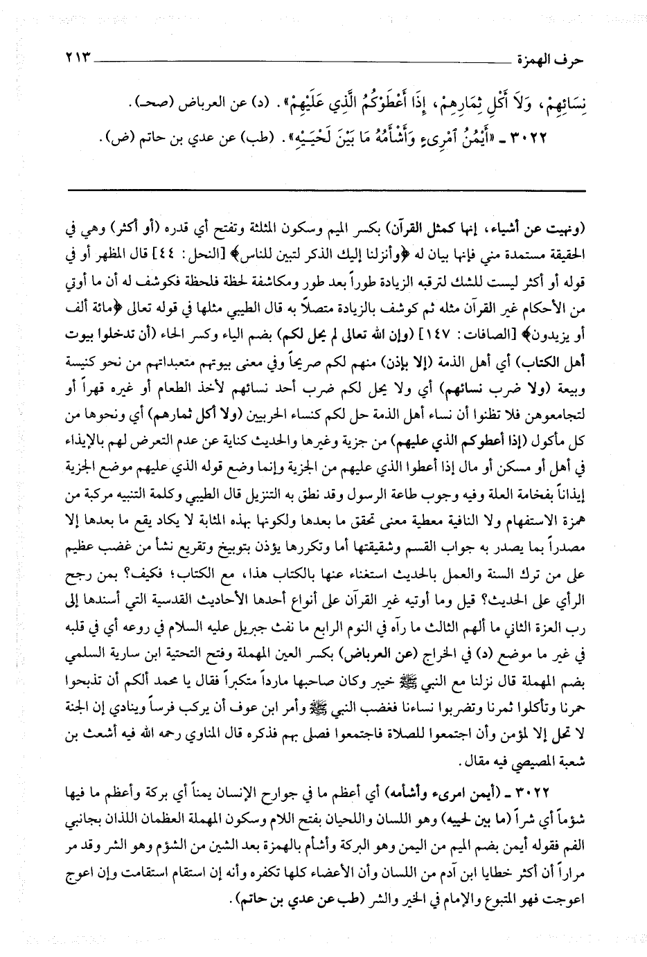 3022 (أيمن امرئ وأشأمه) أي أعظم ما في جوارح الإنسان يمنا أي بركة وأعظم ما فيها شؤما أي شرا (ما بين لحييه) وهو اللسان واللحيان بفتح اللام وسكون المهملة العظمان اللذان بجانبي الفم فقوله أيمن بضم الميم من اليمن وهو البركة وأشأم بالهمزة بعد الشين من الشؤم وهو الشر وقد مر مرارا أن أكثر خطايا ابن آدم من اللسان وأن الأعضاء كلها تكفره وأنه إن استقام استقامت وإن اعوج اعوجت فهو المتبوع والإمام في الخير والشر (طب عن عدي بن حاتم)