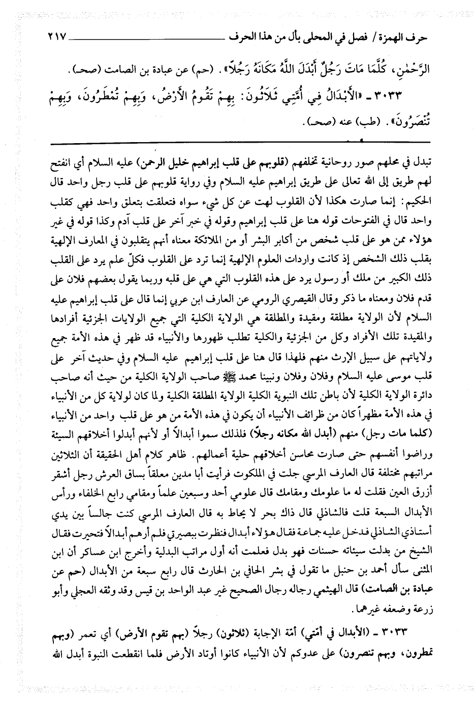 3033 (الأبدال في أمتي) أمة الإجابة (ثلاثون) رجلا (بهم تقوم الأرض) أي تعمر (وبهم تمطرون وبهم تنصرون) على عدوكم لأن الأنبياء كانوا أوتاد الأرض فلما انقطعت النبوة أبدل الله