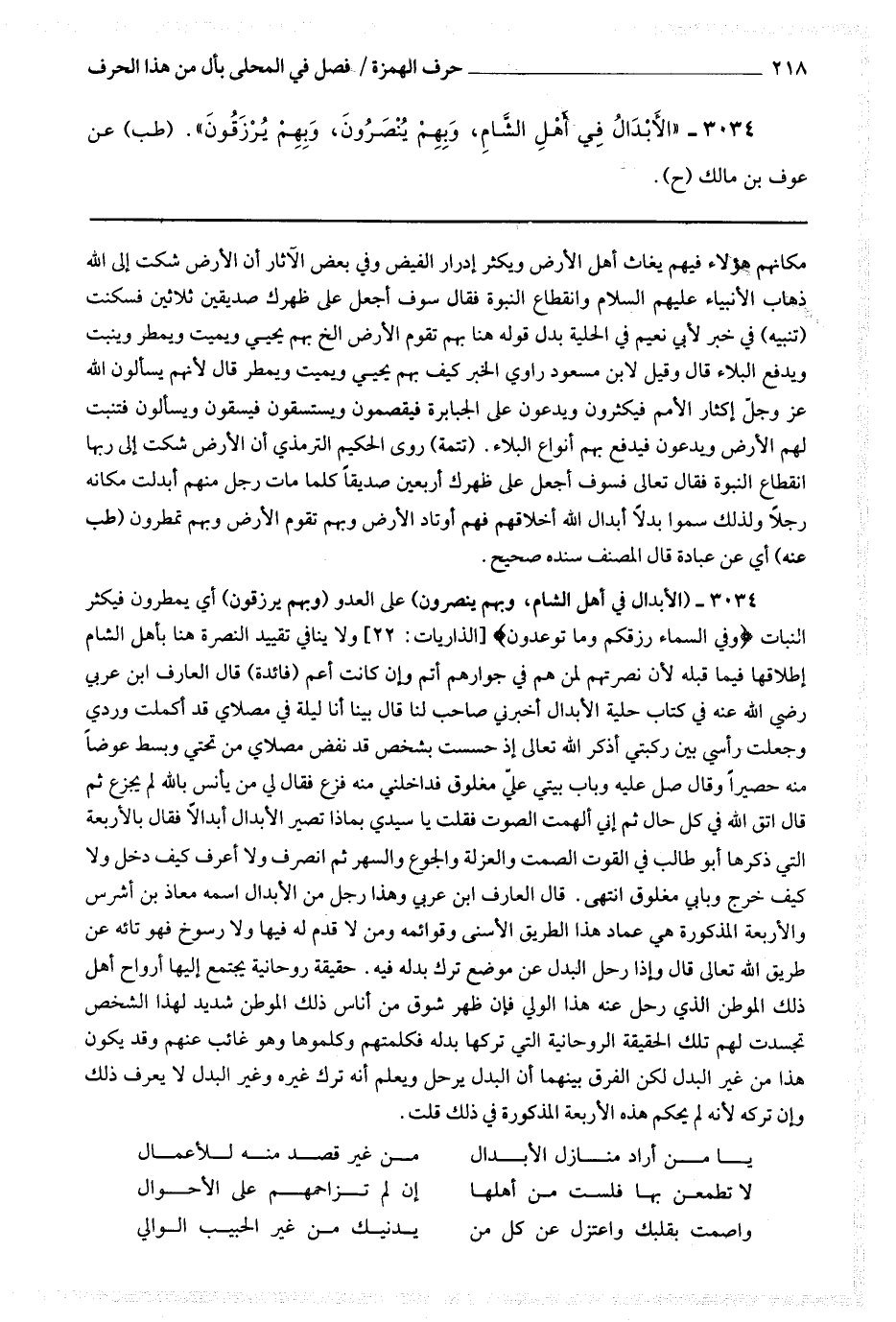 3034 (الأبدال في أهل الشام وبهم ينصرون) على العدو (وبهم يرزقون) أي يمطرون فيكثر النبات * (وفي السماء رزقكم وما توعدون) * ولا ينافي تقييد النصرة هنا بأهل الشام إطلاقها فيما قبله لأن نصرتهم لمن هم في جوارهم أتم وإن كانت أعم (فائدة) قال العارف ابن عربي رضي الله عنه في كتاب حلية الأبدال : أخبرني صاحب لنا قال : بينا أنا ليلة في مصلاي قد أكملت وردي وجعلت رأسي بين ركبتي أذكر الله تعالى إذ حسست بشخص قد نفض مصلاي من تحتي وبسط عوضا عنه حصيرا وقال : صلي عليه وباب بيتي علي مغلوق فداخلني منه فزع فقال لي : من يأنس بالله لم يجزع ثم قال : اتق الله في كل حال ثم إني ألهمت الصوت فقلت : يا سيدي بماذا تصير الأبدال أبدالا فقال : بالأربعة