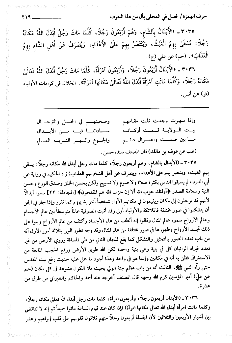 3035 (الأبدال بالشام وهم أربعون رجلا كلما مات رجل أبدل الله مكانه رجلا يسقى بهم الغيث وينتصر بهم على الأعداء ويصرف عن أهل الشام بهم العذاب) زاد الحكيم في رواية عن أبي الدرداء لم يسبقوا الناس بكثرة صلاة ولا صوم ولا تسبيح ولكن بحسن الخلق وصدق الورع وحسن النية وسلامة الصدر * (أولئك حزب الله ألا إن حزب الله هم المفلحون) * سموا أبدالا لأنهم قد يرحلون إلى مكان ويقيمون في مكانهم الأول شخصا آخر يشبههم كما تقرر وإذا جاز في الجن