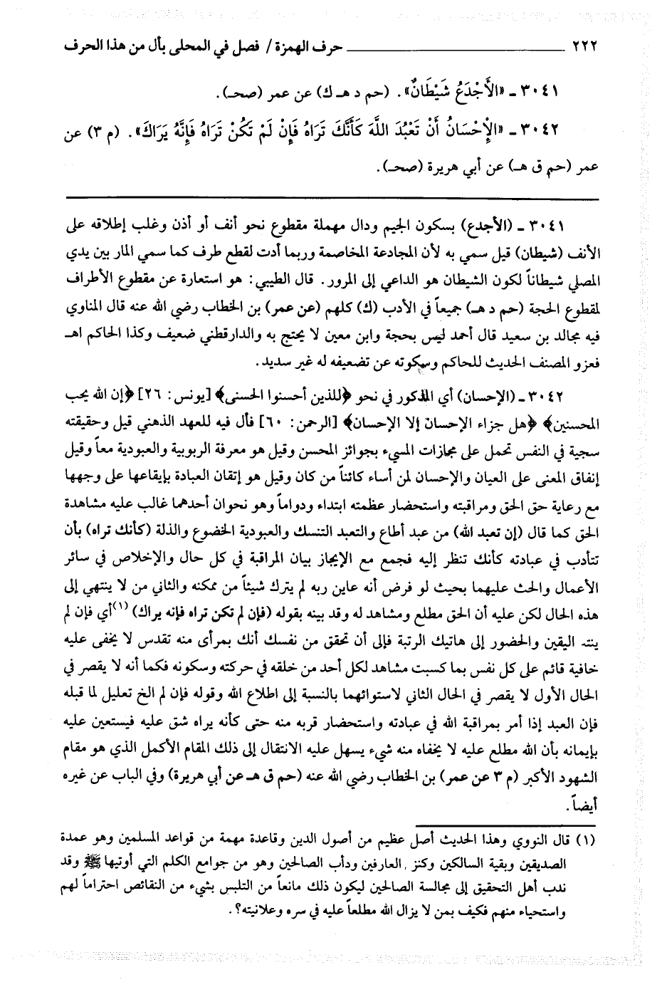 3041 (الإحسان) أي المذكور في نحو * (للذين أحسنوا الحسنى) * * (إن الله يحب المحسنين) * * (هل جزاء الإحسان إلا الإحسان) * فأل فيه للعهد الذهني قيل وحقيقته سجية في النفس تحمل على مجازات المسئ بجوائز المحسن وقيل هو معرفة الربوبية والعبودية معا وقيل انفاق المعنى على العيان والإحسان لمن أساء كائنا من كان وقيل هو إتقان العبادة بإيقاعها على وجهها مع رعاية حق الحق مراقبته واستحضار عظمته ابتداء ودواما وهو نحو أن أحدهما غالب عليه مشاهدة الحق كما قال (أن تعبد الله) من عبد أطاع والتعبد التنسك والعبودية الخضوع والذلة (كأنك تراه) بأن تتأدب في عبادته كأنك تنظر إليه فجمع مع الإيجاز بيان المراقبة في كل حال والإخلاص في سائر الأعمال والحث عليهما بحيث لو فرض أنه عاين ربه لم يترك شيئا من ممكنه والثاني من لا ينتهي إلى هذه الحال لكن عليه أن الحق مطلع عليه ومشاهد له وقد بينه بقوله (فإن لم تكن تراه فإنه يراك) (1) أي فإن لم ينته اليقين والحضور إلى هاتيك الرتبة فإلى أن تحقق من نفسك أنك بمرأى منه تقدس لا يخفى عليه خافية قائم على كل نفس بما كسبت مشاهد لكل أحد من خلقه في حركته وسكونه فكما أنه لا يقصر في الحال الأول لا يقصر في الحال الثاني لاستوائهما بالنسبة إلى إطلاع الله وقوله فإن لم إلخ تعليل لما قبله فإن العبد إذا أمر بمراقبة الله في عبادته واستحضار قربه منه حتى كأنه يراه شق عليه فيستعين عليه بإيمانه بأن الله مطلع عليه لا يخفاه منه شئ يسهل عليه الانتقال إلى ذلك المقام الأكمل الذي هو مقام الشهود الأكبر (م 3 عن عمر) بن الخطاب رضي الله عنه (حم ق ه عن أبي هريرة) وفي الباب عن غيره