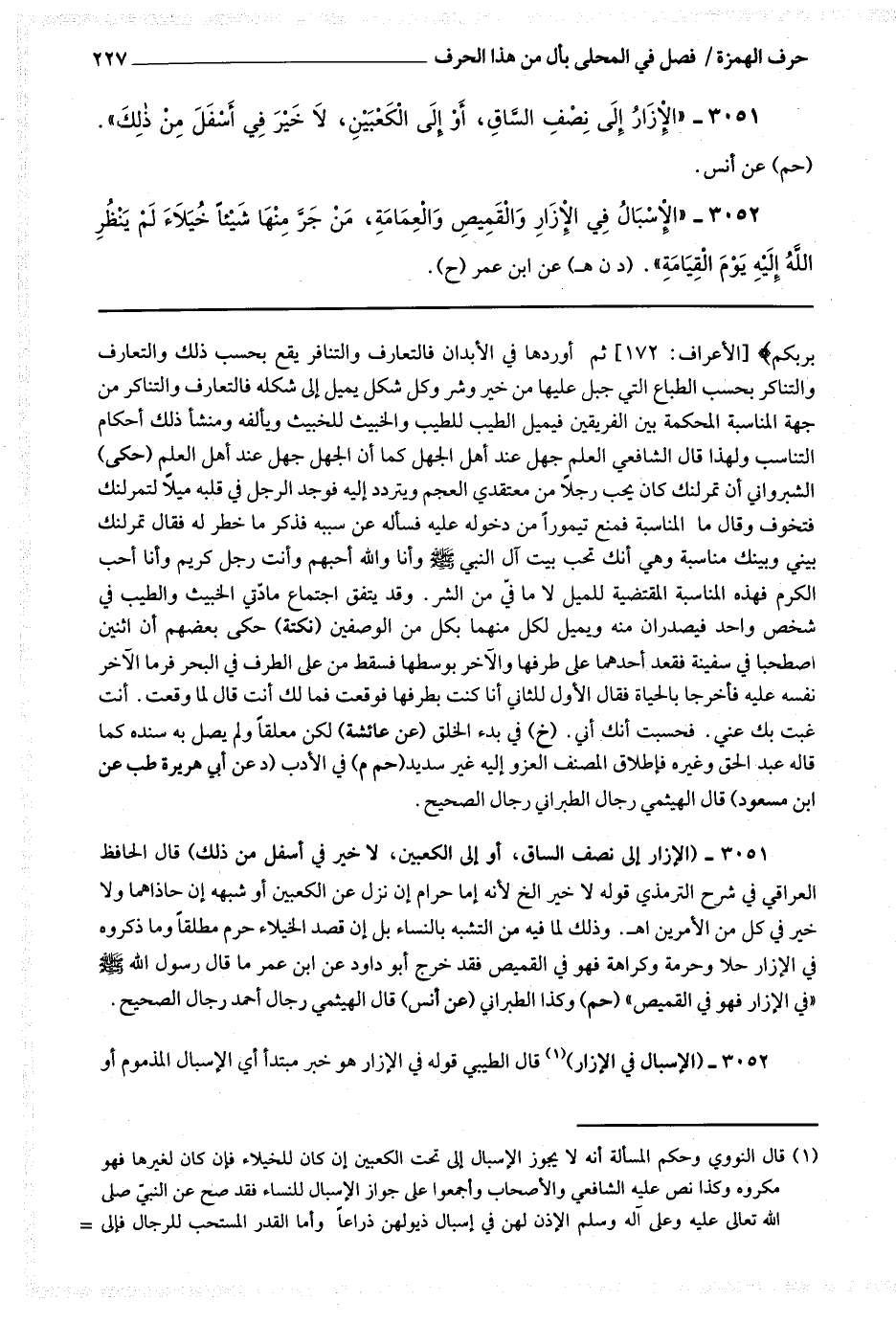 3052 (الإسبال في الإزار) (1) قال الطيبي : قوله في الإزار هو خبر مبتدأ أي الإسبال المذموم أو