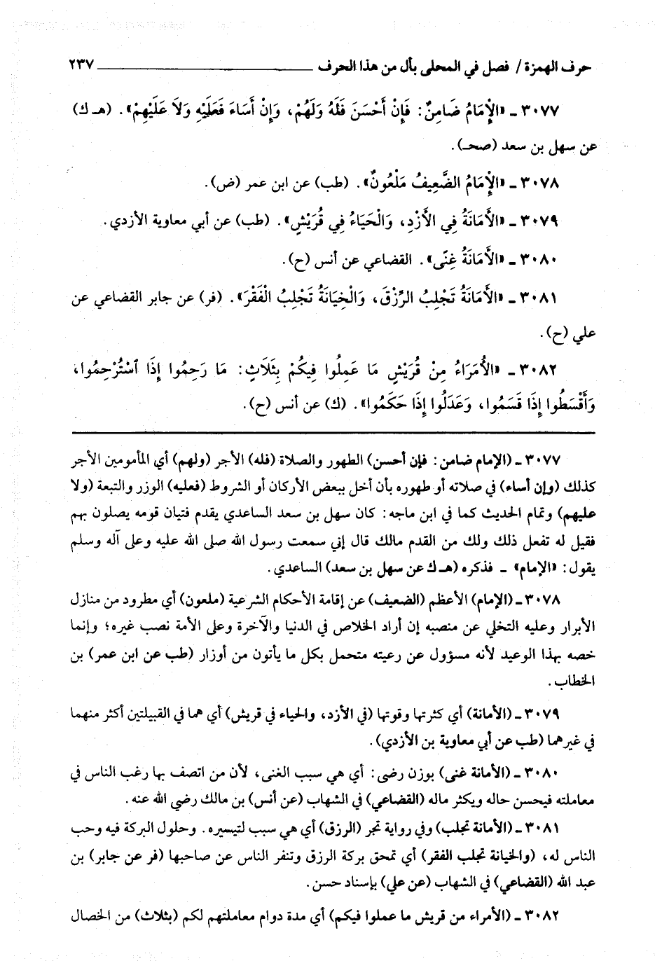 حب هق عن أبي هريرة ، حم عن أبي أمامة) وسنده صحيح 3077 (الإمام ضامن فإن أحسن) الطهور والصلاة (فله) الأجر (ولهم) أي المأمومين الأجر كذلك (وإن أساء) في صلاته أو طهوره بأن أخل ببعض الأركان أو الشروط (فعليه) الوزر والتبعة (ولا عليهم) وتمام الحديث كما في ابن ماجه : كان سهل بن سعد الساعدي يقدم فتيان قومه يصلون بهم فقيل له : تفعل ذلك ولك من القدم ما لك قال : إني سمعت رسول الله صلى الله عليه وعلى آله وسلم يقول : الإمام فذكره (ه ك عن سهل بن سعد) الساعدي.