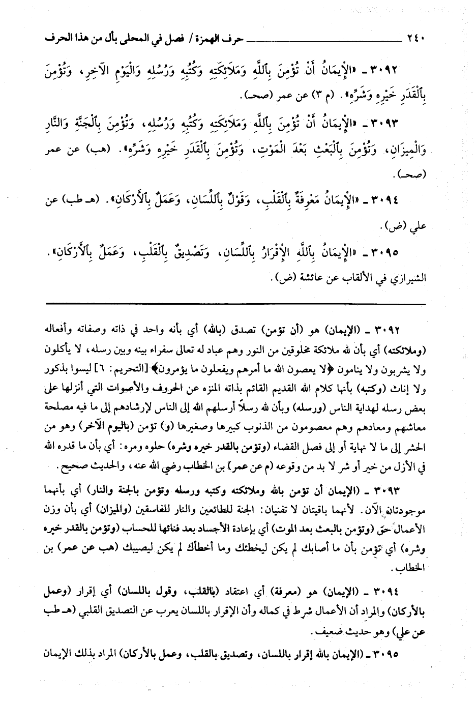 3094 (الإيمان) هو (معرفة) أي اعتقاد (بالقلب وقول باللسان) أي إقرار (وعمل بالأركان) والمراد أن الأعمال شرط في كماله وأن الإقرار باللسان يعرب عن التصديق القلبي.