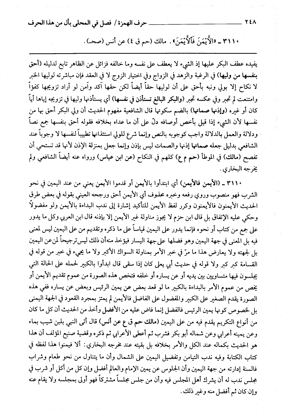 3110 (الأيمن فالأيمن) أي ابتدؤا بالأيمن أو قدموا الأيمن يعني من عند اليمين في نحو الشرب فهو منصوب وروى رفعه وخبره محذوف أي الأيمن أحق ورجحه العيني بقوله في بعض طرق الحديث الأيمنون فالأيمنون وكرر لفظ الأيمن للتأكيد إشارة إلى ندب البداءة بالأيمن ولو مفضولا وحكى عليه الاتفاق بل قال ابن حزم : لا يجوز مناولة غير الأيمن إلا بإذنه قال ابن العربي : وكل ما يدور على جمع من كتاب أو نحوه فإنما يدور على اليمين قياسا على ما ذكر وتقديم من على اليمين ليس لمعنى فيه بل المعنى في جهة اليمين وهو فضلها على جهة اليسار فيؤخذ منه أن ذلك ليس ترجيحا لمن عن اليمين بل لجهته ولا يعارض هذا ما مر في خبر الأمر بمناولة السواك الأكبر ولا ما يجئ في خبر من قوله في القسامة كبر كبر ولا قوله في حديث أبي يعلى : كان إذا سقي قال : ابدأوا بالكبير لحمله على الحالة التي يجلسون فيها متساويين بين يديه أو عن يساره أو خلفه فتخص هذه الصورة من عموم تقديم الأيمن أو يخص من عموم الأمر بالبداءة بالكبير ما لو قعد بعض عن يمين الرئيس وبعض عن يساره ففي هذه