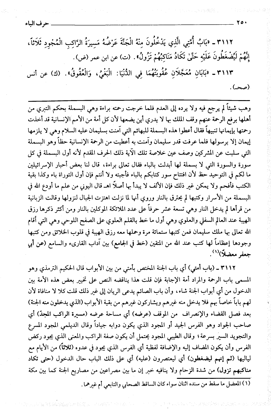 3112 (باب أمتي) أي باب الجنة المختص بأمتي من بين الأبواب قال الحكيم الترمذي : وهو المسمى باب الرحمة والمراد أمة الإجابة فإن قلت : هذا يناقضه النص على تخيير بعض هذه الأمة بين الدخول من أي أبواب الجنة شاء ، وأن باب الصائم يدعى الريان إلى غيرذلك قلت : كلا لا منافاة لأن لهم بابا خاصا بهم فلا يدخل منه غيرهم ويشاركون غيرهم من بقية الأبواب (الذي يدخلون منه الجنة) بعد فصل القضاء والانصراف من الموقف (عرضه) أي مساحة عرضه (مسيرة الراكب المجد) أي صاحب الجواد وهو الفرس الجيد أو المجود الذي يكون دوابه جيادا وقال الديلمي : المجود المسرع والتجويد السير بسرعة ، وقال الطيبي : المجود يحتمل أن يكون صفة لراكب والمعنى الذي يجود ركض الفرس وأن يكون المضاف إليه والإضافة لفظية أي الفرس الذي يجود في عدوه (ثلاثا) من الأيام مع لياليها (ثم إنهم ليضغطون) أي ليعتصرون (عليه) أي على ذلك الباب حال الدخول (حتى تكاد مناكبهم تزول) من شدة الزحام ولا ينافيه خبر إن ما بين مصراعين من مصاريع الجنة كما بين مكة