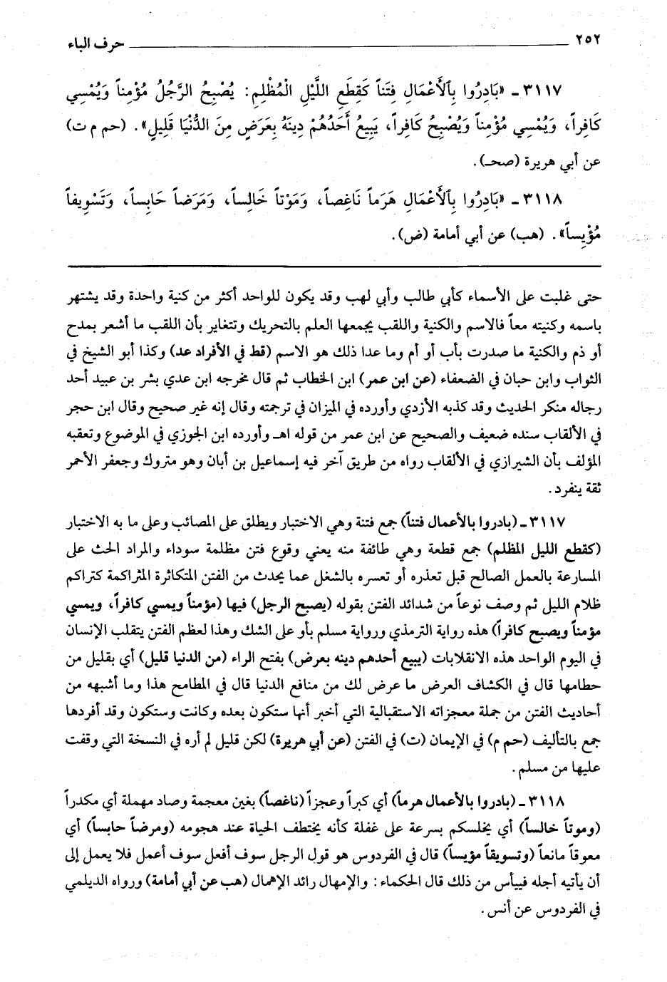 3117 (بادروا بالأعمال فتنا) جمع فتنة وهي الاختبار ويطلق على المصائب وعلى ما به الاختبار (كقطع الليل المظلم) جمع قطعة وهي طائفة منه يعني وقوع فتن مظلمة سوداء والمراد الحث على المسارعة بالعمل الصالح قبل تعذره أو تعسره بالشغل عما يحدث من الفتن المتكاثرة والمتراكمة كتراكم ظلام الليل ثم وصف نوعا من شدائد الفتن بقوله (يصبح الرجل) فيها (مؤمنا ويمسي كافرا ويمسي مؤمنا ويصبح كافرا) هذه رواية الترمذي ورواية مسلم بأو على الشك وهذا لعظم الفتن يتقلب الإنسان في اليوم الواحد هذه الإنقلابات (يبيع أحدهم دينه بعرض) بفتح الراء (من الدنيا قليل) أي بقليل من حطامها قال في الكشاف : العرض ما عرض لك من منافع الدنيا قال في المطامح : هذا وما أشبهه من أحاديث الفتن من جملة معجزاته الاستقبالية التي أخبر أنها ستكون بعده وكانت وستكون وقد أفردها جمع بالتأليف (حم م) في الإيمان (ت) في الفتن (عن أبي هريرة) لكن قليل لم أره في النسخة التي وقفت عليها من مسلم.