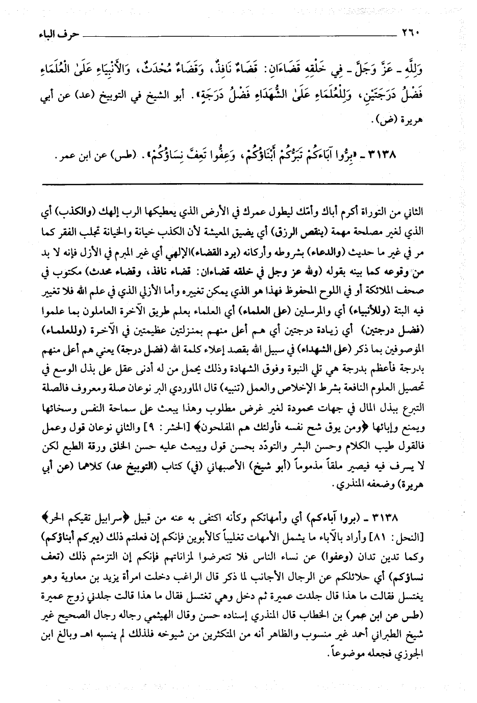 3138 (بروا آباءكم) أي وأمهاتكم وكأنه اكتفى به عنه من قبيل * (سرابيل تقيكم الحر) * وأراد بالآباء ما يشمل الأمهات تغليبا كالأبوين فإنكم إن فعلتم ذلك (يبركم أبناؤكم) وكما تدين تدان (وعفوا) عن نساء الناس فلا تتعرضوا لمزاناتهم فإنكم إن التزمتم ذلك (تعف نساؤكم) أي حلائلكم عن الرجال الأجانب لما ذكر قال الراغب : دخلت امرأة يزيد ابن معاوية وهو يغتسل فقالت : ما هذا قال : جلدت عميرة ثم دخل وهي تغتسل فقال : ما هذا قالت : جلدني زوج عميرة (طس عن ابن عمر) بن الخطاب قال المنذري : إسناده حسن وقال الهيثمي : رجاله رجال الصحيح غير شيخ الطبراني أحمد غير منسوب والظاهر أنه من المتكثرين من شيوخه فلذلك لم ينسبه اه وبالغ ابن الجوزي فجعله موضوعا.