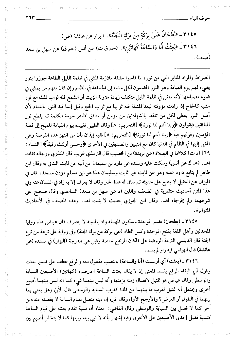 3146 (بعثت) أي أرسلت (أنا والساعة) بالنصب مفعول معه والرفع عطف على ضمير بعثت وقوأبي البقاء الرفع يفسد المعنى إذ لا يقال بعثت الساعة اعترضوه (كهاتين) الأصبعين السبابة والوسطى وقال عياض : هو تمثيل لاتصال زمنه بزمنها وأنه ليس بينهما شئ كما أنه ليس بينهما أصبع أخرى ويحتمل أنه تمثيل لقرب ما بينهما من المدة كقرب السبابة والوسطى قال الأبي : وهل يعني بما