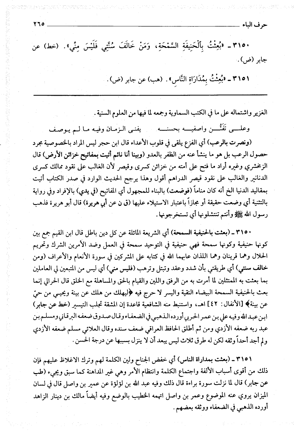 3150 (بعثت بالحنيفية السمحة) أي الشريعة المائلة عن كل دين باطل قال ابن القيم : جمع بين كونها حنيفية وكونها سمحة فهي حنيفة في التوحيد سمحة في العمل وضد الأمرين الشرك وتحريم الحلال وهما قربتان وهما اللذان عابهما الله في كتابه على المشركين في سورة الأنعام والأعراف (ومن خالف سنتي) أي طريقتي بأن شدد وعقد وتبتل وترهب (فليس مني) أي ليس من المتبعين لي العاملين بما بعثت به الممتثلين لما أمرت به من الرفق واللين والقيام بالحق والمساهلة مع الخلق قال الحرالي : إنما بعث بالحنيفية السمحة البيضاء النقية واليسر الذي لا حرج فيه (ليهلك من هلك عن بينة ويحيى من حي عن بينة) اه ، واستنبط منه الشافعية قاعدة إن المشقة تجلب التيسير (خط عن جابر) بن عبد الله وفيه علي بن عمر الحربي أورده الذهبي في الضعفاء وقال صدوق ضعفه البرقاني ومسلم بن