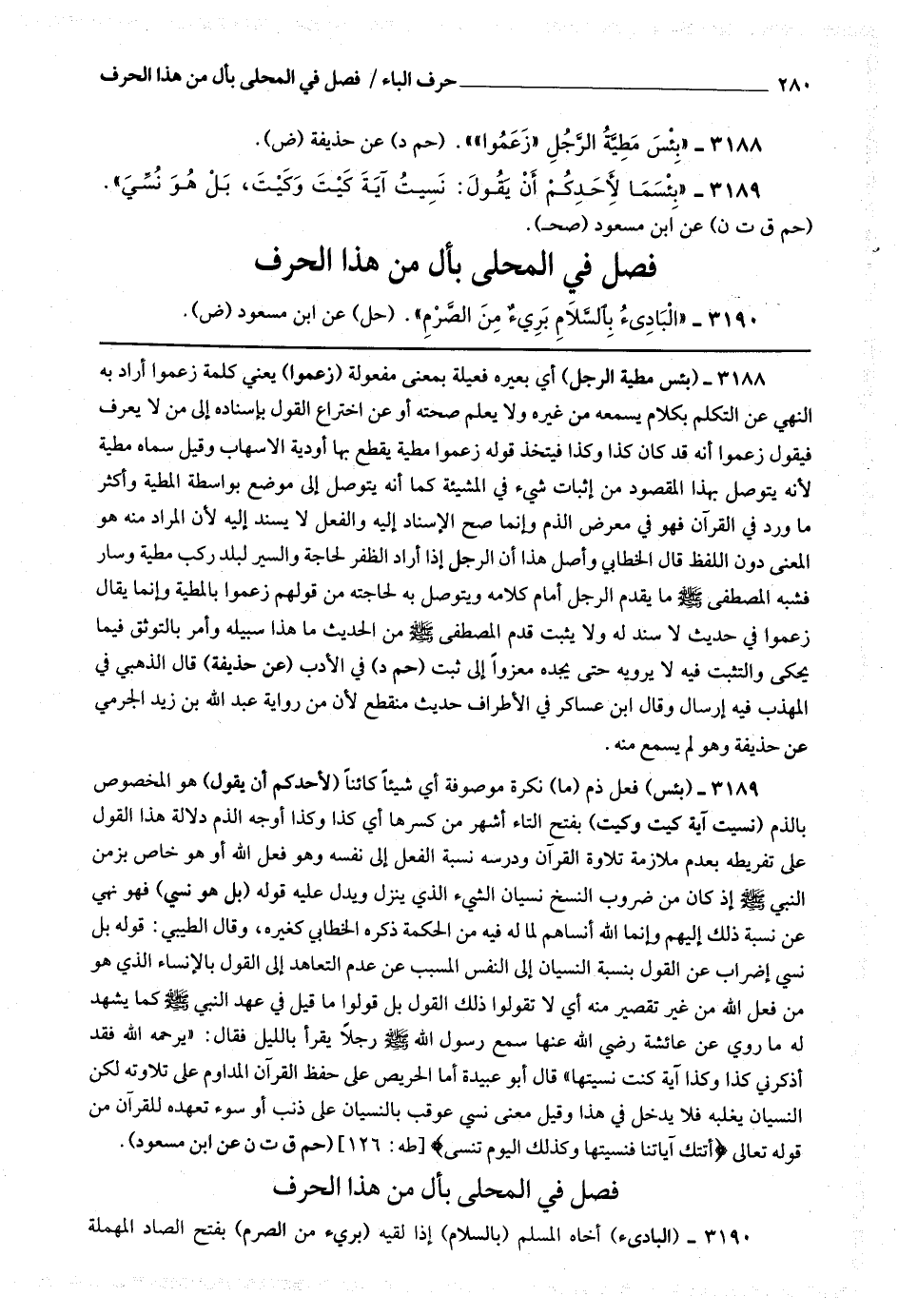 دار الحديث] 3189 (بئس) فعل ذم (ما) نكرة موصوفة أي شيئا كائنا (لأحدكم أن يقول) هو المخصوص بالذم (نسيت آية كيت وكيت) بفتح التاء أشهر من كسرها أي كذا وكذا أوجه الذم دلالة هذا القول على تفريطه بعدم ملازمة تلاوة القرآن ودرسه نسبة الفعل إلى نفسه وهو فعل الله أو هو خاص بزمن النبي صلى الله عليه وسلم إذ كان من ضروب النسخ نسيان الشئ الذي ينزل ويدل عليه قوله (بل هو نسي) فهو نهي عن نسبة ذلك إليهم وإنما الله أنساهم لما له فيه من الحكمة ذكره الخطابي كغيره، وقال الطيبي: قوله بل نسي إضراب عن القول بنسبة النسيان إلى النفس المسبب عن عدم التعاهد إلى القول بالإنساء الذي هو من فعل الله من غير تقصير منه أي لا تقولوا ذلك القول بل قولوا ما قيل في عهد النبي صلى الله عليه وسلم كما يشهد