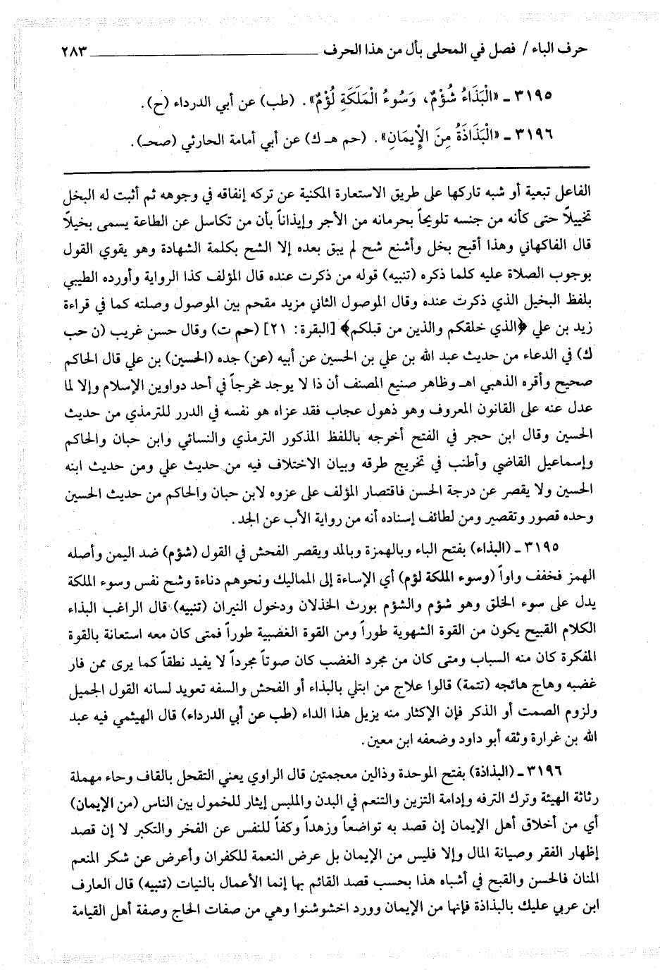 3195 (البذاء) بفتح الباء وبالهمزة وبالمد وبقصر الفحش في القول (شؤم) ضد اليمين وأصله الهمز فخفف واوا (وسوء الملكة لؤم) أي الإساءة إلى المماليك ونحوهم دناءة وشح نفس وسوء الملكة يدل على سوء الخلق وهو شؤم والشؤم يورث الخذلان ودخول النيران.