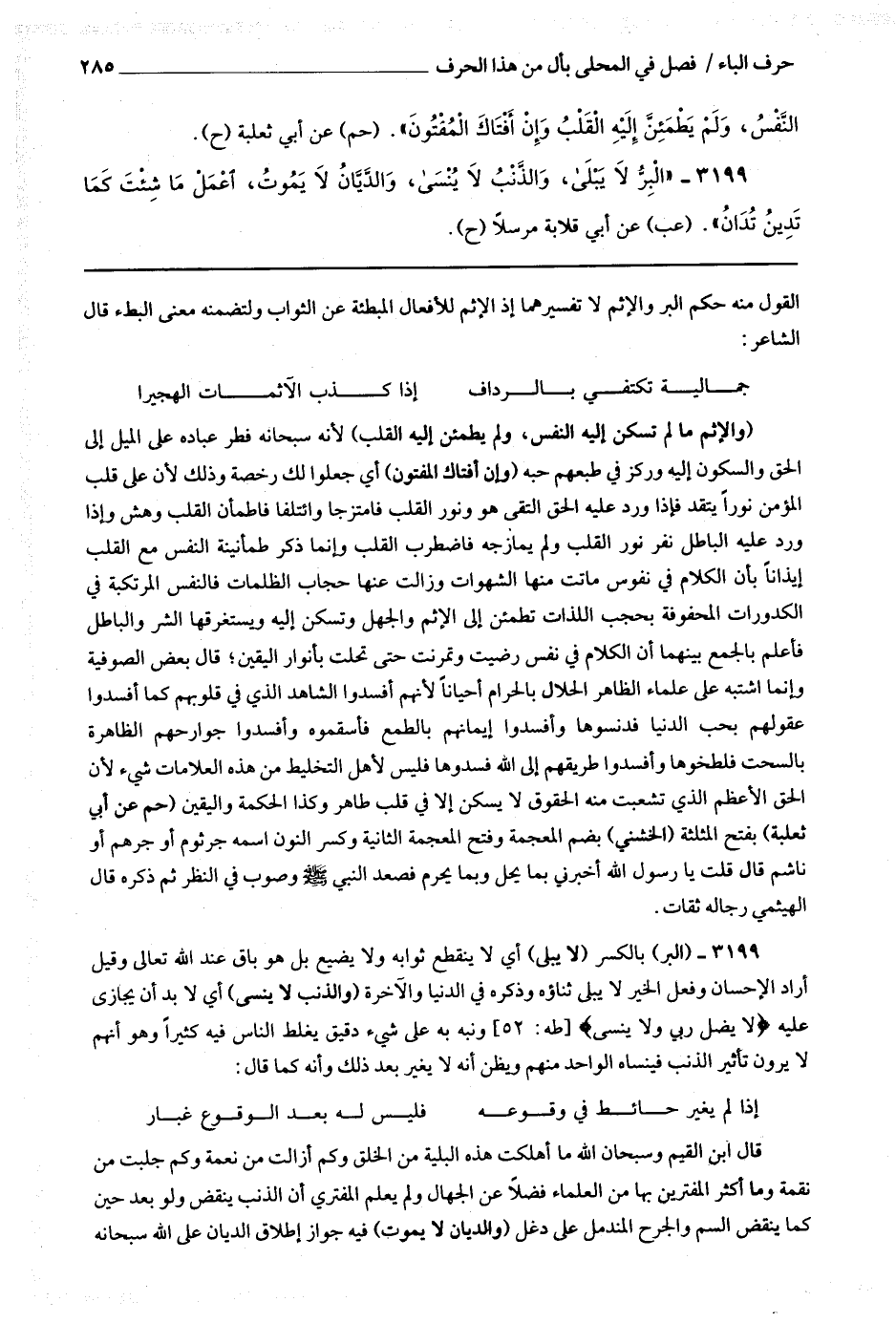 القول منه حكم البر والإثم لا تفسيرهما إذ الإثم للأفعال المبطئة عن الثواب ولتضمنه معنى البطء قال الشاعر : جمالية تكتفي بالرداف * إذا كذب الآثمات الهجيرا (والإثم ما لم تسكن إليه النفس ولم يطمئن له القلب) لأنه سبحانه فطر عباده على الميل إلى الحق والسكون إليه وركز في طبعهم حبه (وإن أفتاك المفتون) أي جعلوا لك رخصة وذلك لأن على قلب المؤمن نورا يتقد فإذا ورد عليه الحق التقى هو ونور القلب فامتزجا وائتلفا فاطمئن القلب وهش وإذا ورد عليه الباطل نفر نور القلب ولم يمازجه فاضطرب القلب وإنما ذكر طمأنينة النفس مع القلب إيذانا بأن الكلام في نفوس ماتت منها الشهوات وزالت عنها حجاب الظلمات فالنفس المرتكبة في الكدورات المحفوفة بحجب اللذات تطمئن إلى الإثم والجهل وتسكن إليه ويستغرقها الشر والباطل فأعلم بالجمع بينهما أن الكلام في نفس رضيت وتمرنت حتى تجلت بأنوار اليقين ، قال بعض الصوفية وإنما اشتبه على علماء الظاهر الحلال بالحرام أحيانا لأنهم أفسدوا الشاهد الذي في قلوبهم كما أفسدوا عقولهم بحب الدنيا فدنسوها وأفسدوا إيمانهم بالطمع فأسقموه وأفسدوا جوارحهم الظاهرة بالسحت فلطخوها وأفسدوا طريقهم إلى الله فسدوها فليس لأهل التخليط من هذه العلامات شئ لأن الحق الأعظم الذي تشعبت منه الحقوق لا يسكن إلا في قلب طاهر وكذا الحكمة واليقين (حم عن أبي