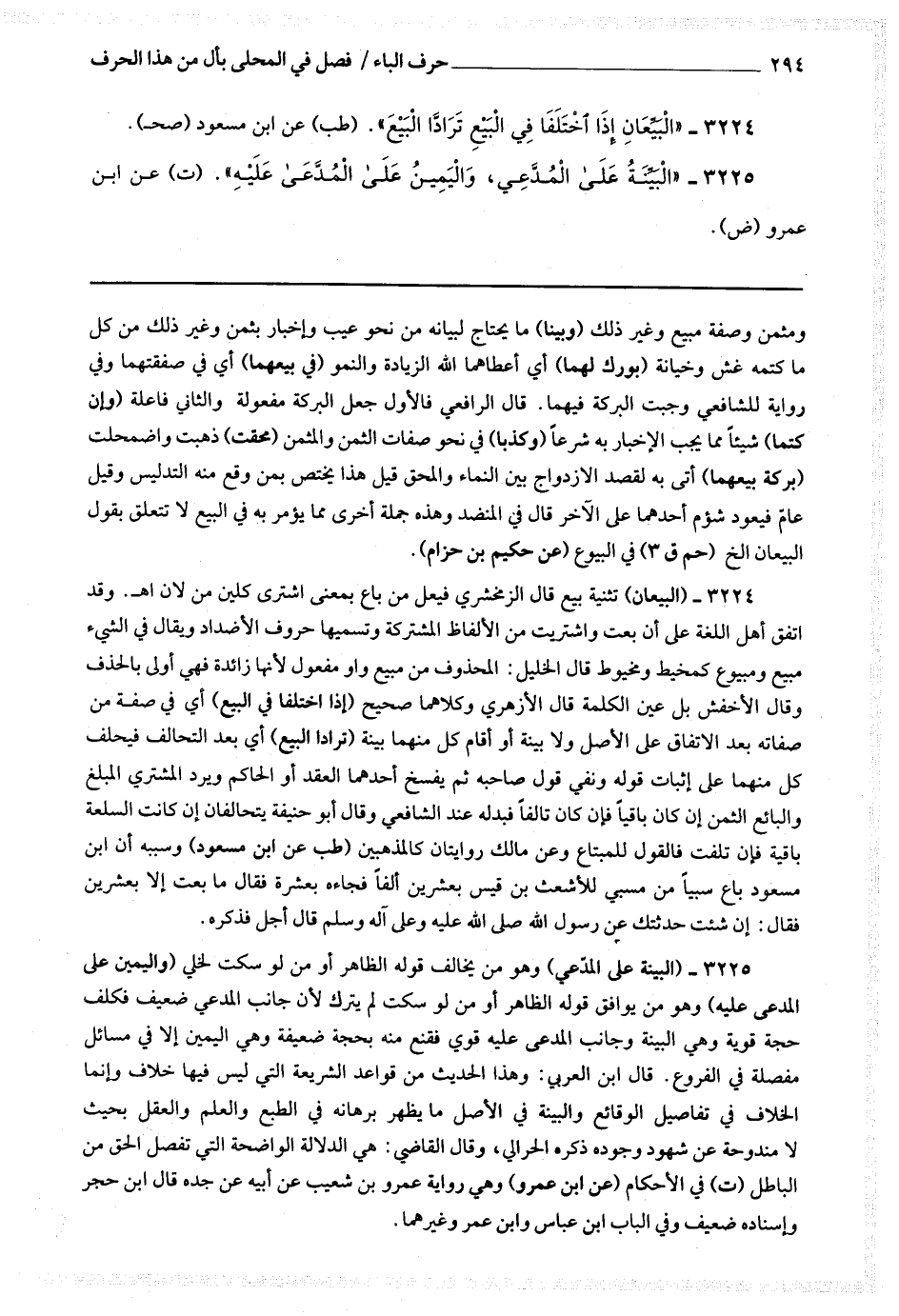 3225 (البينة على المدعي) وهو من يخالف قوله الظاهر أو من لو سكت لخلى (واليمين على المدعى عليه) وهو من يوافق قوله الظاهر أو من لو سكت لم يترك لأن جانب المدعي ضعيف فكلف حجة قوية وهي البينة وجانب المدعى عليه قوي فقنع منه بحجة ضعيفة وهي اليمين إلا في مسائل مفصلة في الفروع.