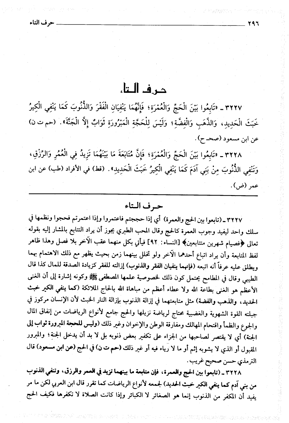 3228 (تابعوا بين الحج والعمرة فإن متابعة ما بينهما تزيد في العمر والرزق وتنفي الذنوب من بني آدم كما ينفي الكير خبث الحديد) لجمعه لأنواع الرياضات كما تقرر قال ابن العربي: لكن ما مر يفيد أن المكفر من الذنوب إنما هو الصغائر لا الكبائر وإذا كانت الصلاة لا تكفرها فكيف الحج