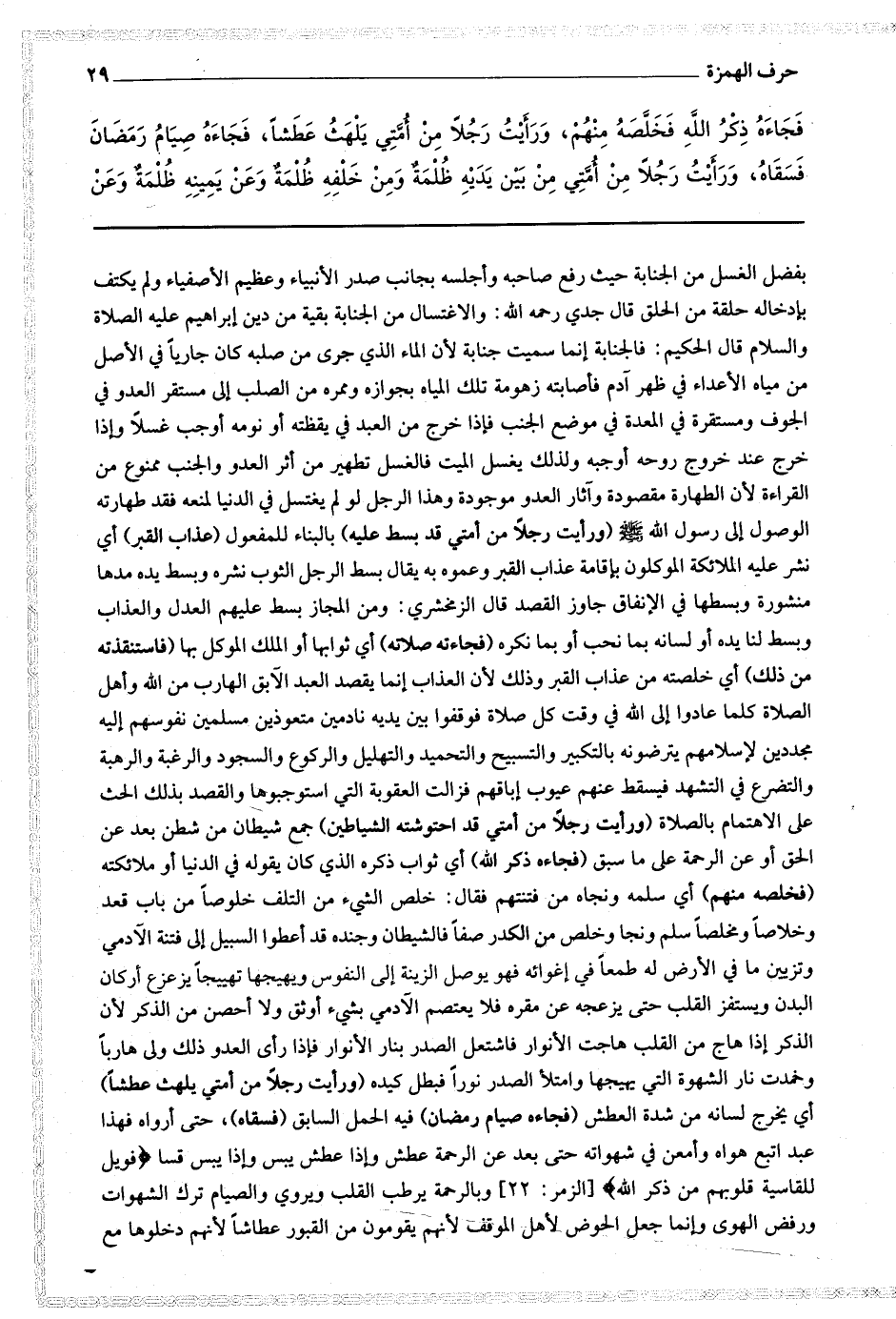 رعد لي فلان وأبرق أرعد والسعف أغصان النخل ما دامت بالخوص فإن جرد الخوص قيل جريد (ورأيت رجلا من أمتي يزحف على الصراط) أي يجر أسته عليه لا يستطيع المشي (مرة ويحبو مرة) لفظ رواية الحكيم يزحف أحيانا ويحبو أحيانا هذا صريح في أن الحبو يغاير الزحف والذي في الصحاح والأساس وغيرهما أن الحبو الزحف فليحرر (فجاءته صلاته علي فأخذت بيده فأقامته على الصراط حتى جاز) أي حتى قطع الصراط ونفذ منه ومضى إلى الجنة سالما يقال جاز المكان يجوزه سار فيه وأجازه بالألف قطعه وأجازه نفذه وجاز العقد وغيره نفذ ومضى على الصحة ولفظ رواية الحكيم بذل حتى جاز فأقامته ومضى على الصراط وذلك لأن الصلاة على المصطفى صلى الله عليه وسلم تأخذ بيده في وقت عثراته بمنزلة الطفل إذا مشى فتعثر في مشيه عجل إليه أبوه فبادر حتى يأخذ بيده فيقيمه فصارت صلوات العباد على نبيهم بمنزلة ذلك الأب العطوف الذي كلما عثر ولده بادر لعطفه بحفظه وإقامته (ورأيت رجلا من أمتي انتهى إلى أبواب الجنة فغلقت الأبواب دونه فجاءته شهادة أن لا إله إلا الله) أي وأن محمدا رسول الله فاكتفى بأحد الشقين عن الآخر لكونه معروفا بينهم (فأخذت بيده فأدخلته الجنة) أي فتحت له الأبواب التي أغلقت دونه فدخلها لأن هذه كلمة جامعة جعلت مفتاحا لأبواب الجنة وقد جاء في حديث إن المؤمنين يدعون من باب الجنة وإن أبوابها مقسومة على أبواب البر فباب للصلاة وباب للصيام وباب للصدقة وباب للحج وباب للجهاد وباب للأرحام وباب لمظالم العباد وهو آخرها فهذه سبعة أبواب مقسومة على أعمال البر وكذلك أبواب النيران مقسومة على أهلها ولكل باب منهم جزء مقسوم وباب للجنة زائد لأهل الشهادة يسمى باب التوبة فأري رسول الله صلى الله عليه وسلم في المنام هذه الرؤيا ورؤيا الأنبياء حق ووحي ليعلم العباد قوة هذه الأفعال الصادرة من العبيد أيام الدنيا ينادى لكل نوع