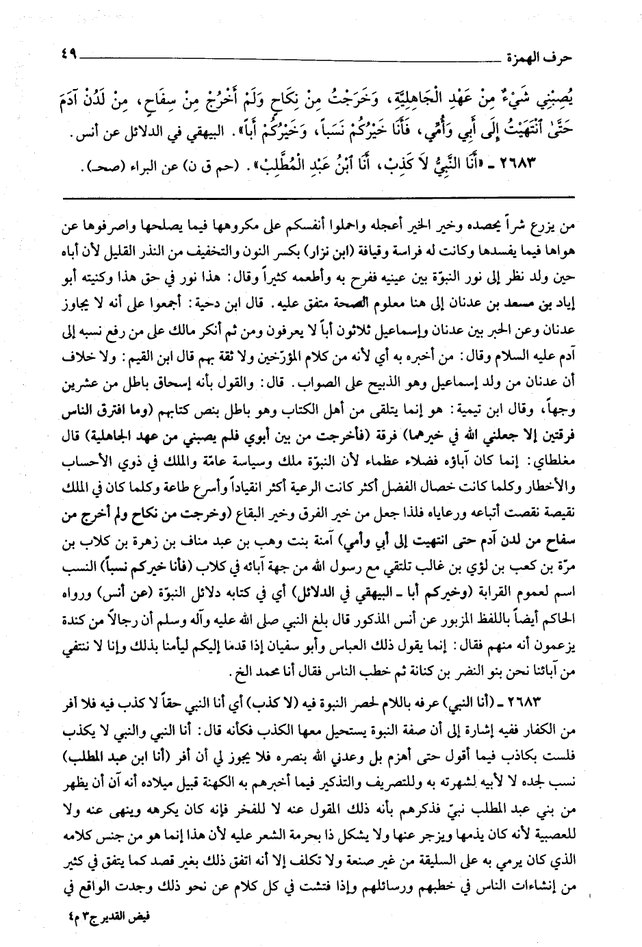 2690 (أنا أول من تنشق عنه الأرض) أي أول من تعاد فيه الروح يوم القيامة ويظهر (فأكسى بالبناء للمجهول (حلة من حلل الجنة) ويشاركه في ذلك إبراهيم الخليل عليه السلام وهذا دلالة على قربه من ربه وكرامته عليه إذ يكسى حيث عري الناس من لباس الجنة قبل دخولها كدأب الملوك مع خواصها فله المقام الخاص المعبر عنه بالمحمود ألا ترى إلى قوله (ثم أقوم عن يمين العرش) تلويح بقربه من ربه وكرامته عنده إذ يكسى من الجنة قبل دخولها بلباس ويقوم عن يمين العرش (ليس أحد من الخلائق يقوم ذلك المقام غيري) خصيصة شرفني الله تعالى بها ، وأحد أعم العام وهو مدخول النفي والخلائق جمع خلق فبشمل الثقلين والملائكة وهذا هو الفضل المطلق ولا يعارضه خبر الشيخين أنا أول من يرفع رأسه بعد النفخة فإذا موسى عليه السلام متعلق بالعرش لجواز أن يكون بعد البعث صعقة فزع يسقط الكل ولا يسقط موسى عليه السلام اكتفاء بصعقة الطور فحين يرفع رأسه من هذه الصعقة يراه أخذا بجانب العرش فيكون المراد من النفخة تلك الصعقة ذكره القاضي (ت عن أبي هريرة)