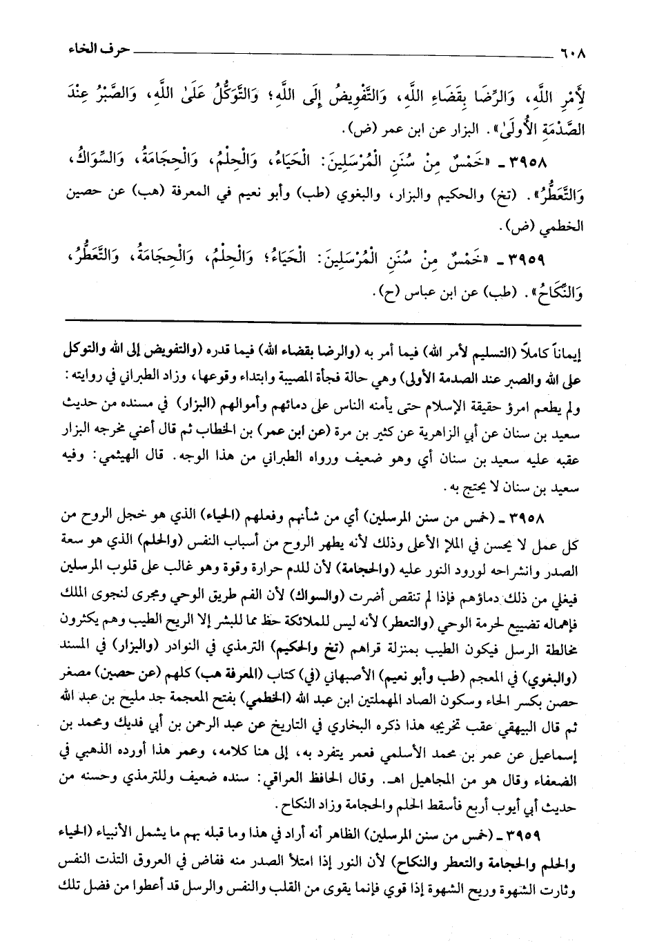 3958 (خمس من سنن المرسلين) أي من شأنهم وفعلهم (الحياء) الذي هو خجل الروح من كل عمل لا يحسن في الملأ الأعلى وذلك لأنه يطهر الروح من أسباب النفس (والحلم) الذي هو سعة الصدر وانشراحه لورود النور عليه (والحجامة) لأن للدم حرارة وقوة وهو غالب على قلوب المرسلين فيغلي من ذلك دماؤهم فإذا لم تنقص أضرت (والسواك) لأن الفم طريق الوحي ومحل لنجوى الملك فإهماله تضييع لحرمة الوحي (والتعطر) لأنه ليس للملائكة حظ مما للبشر إلا الريح الطيب وهم يكثرون مخالطة الرسل فيكون الطيب بمنزلة قراهم.