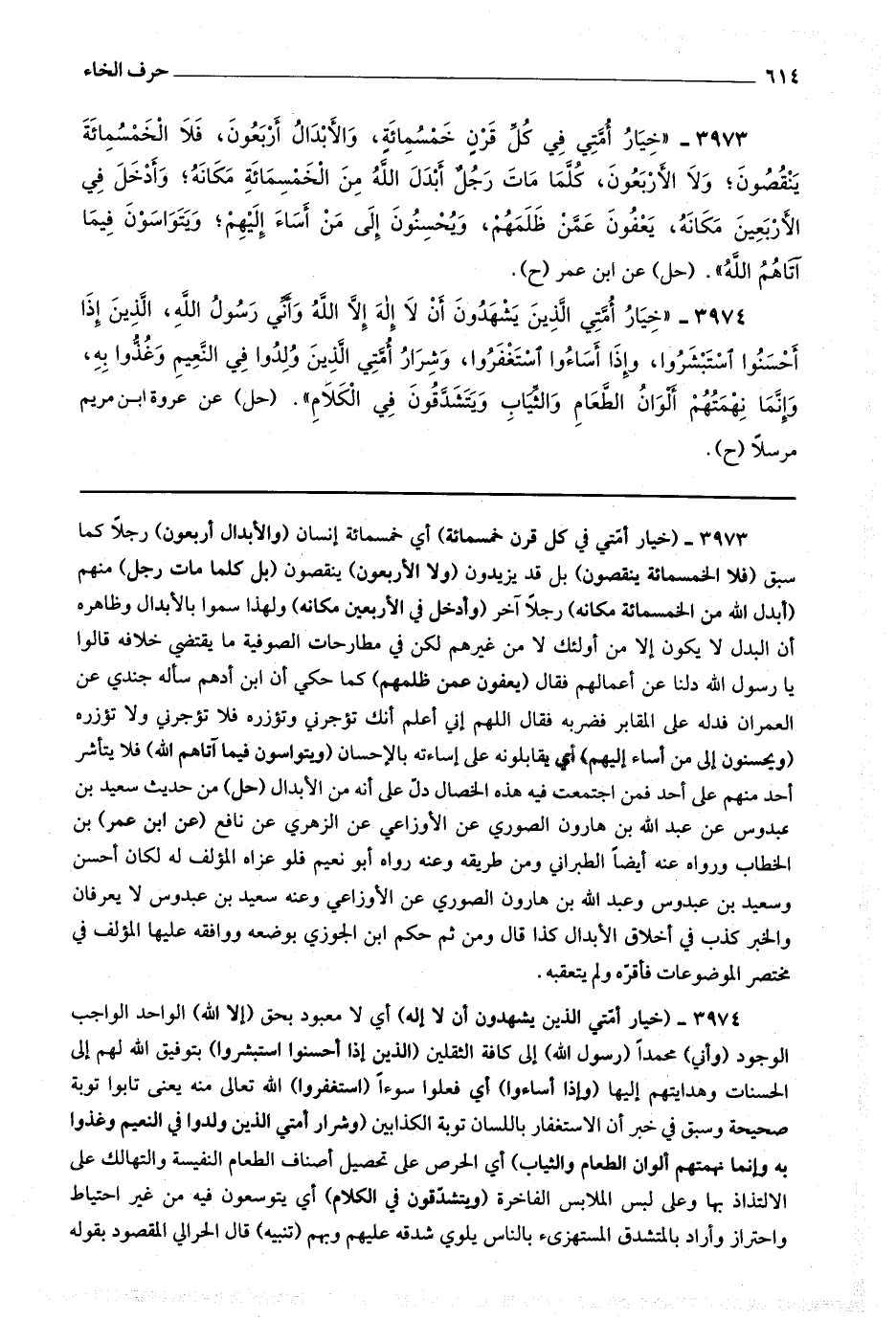 3973 (خيار أمتي في كل قرن خمسمائة) أي خمسمائة إنسان (والأبدال أربعون) رجلا كما سبق (فلا الخمسمائة ينقصون) بل قديزيدون (ولا الأربعون) ينقصون (بل كلما مات رجل) منهم (أبدل الله من الخمسمائة مكانه) رجلا آخر (وأدخل في الأربعين مكانه) ولهذا سموا بالأبدال وظاهره أن البدل لا يكون إلا من أولئك لا من غيرهم لكن في مطارحات الصوفية ما يقتضي خلافه قالوا يا رسول الله دلنا عن أعمالهم فقال (يعفون عمن ظلمهم) كما حكى أن ابن أدهم سأله جندي عن العمران فدله على المقابر فضربه فقال اللهم إني أعلم أنك تؤجرني وتؤزره فلا تؤجرني ولا تؤزره