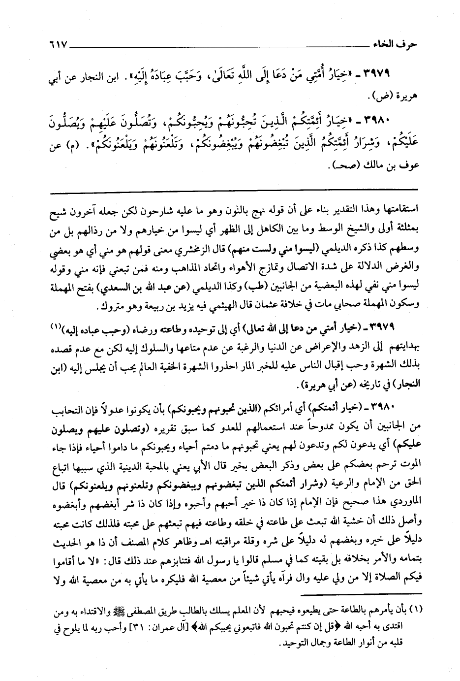 3980 (خيار أئمتكم) أي أمرائكم (الذين تحبونهم ويحبونكم) بأن يكونوا عدولا فإن التحابب من الجانبين أن يكون ممدوحا عند استعمالهم للعدو كما سبق تقريره (وتصلون عليهم ويصلون عليكم) أي يدعون لكم وتدعون لهم يعني تحبونهم ما دمتم أحياء ويحبونكم ما داموا أحياء فإذا جاء الموت ترحم بعضكم على بعض وذكر البعض بخير قال الأبي : يعني بالمحبة الدينية الذي سببها اتباع الحق من الإمام والرعية (وشرار أئمتكم الذين تبغضونهم ويبغضونكم وتلعنونهم ويلعنونكم) قال