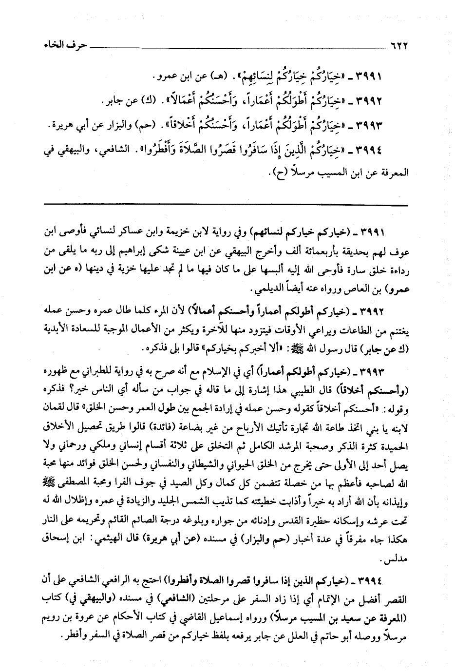 3994 (خياركم الذين إذا سافروا قصروا الصلاة وأفطروا) احتج به الرافعي الشافعي على أن القصر أفضل من الإتمام أي إذا زاد السفر على مرحلتين.